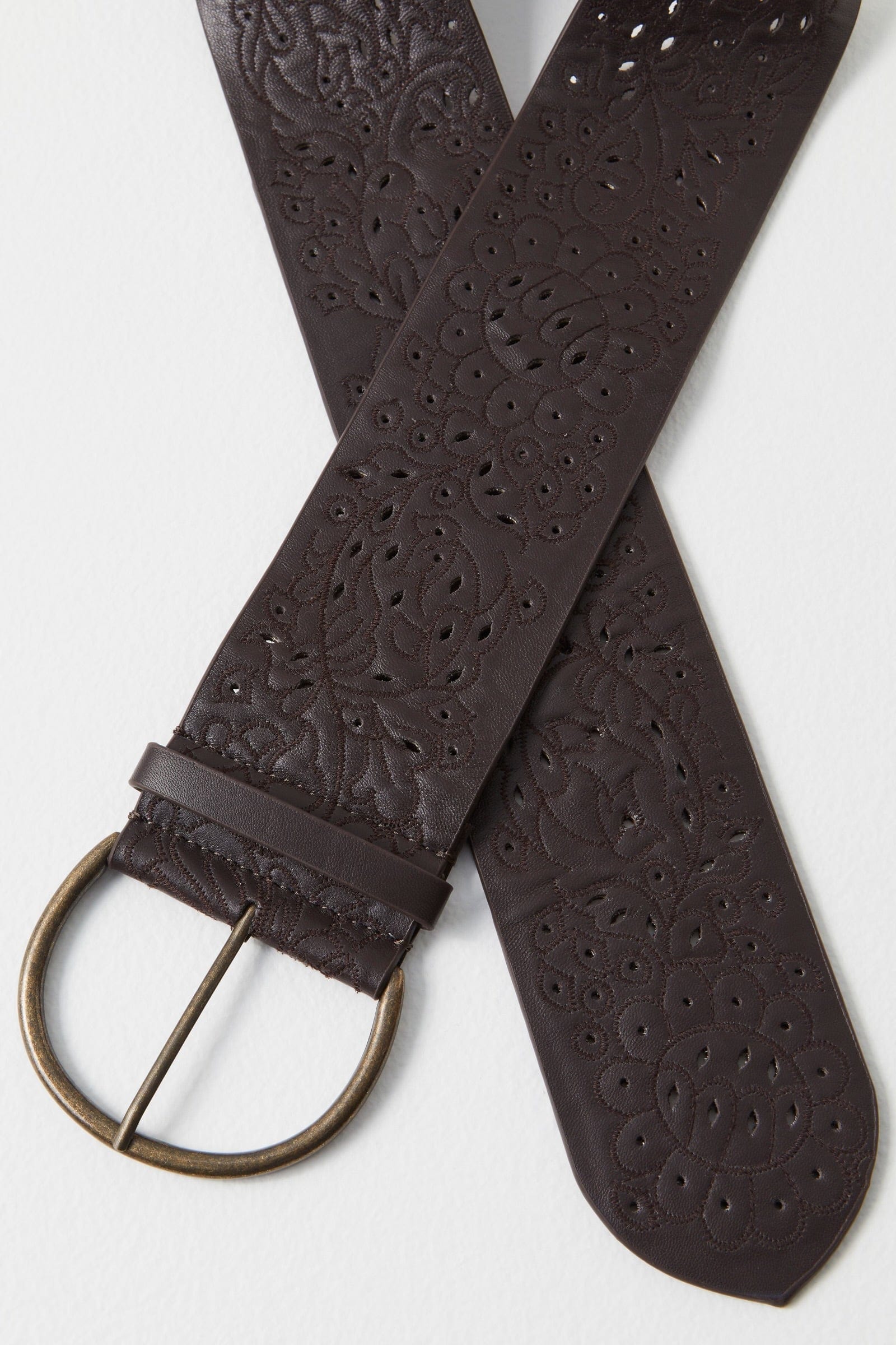 Chocolate brown hip belt with laser cuts, and embroidery