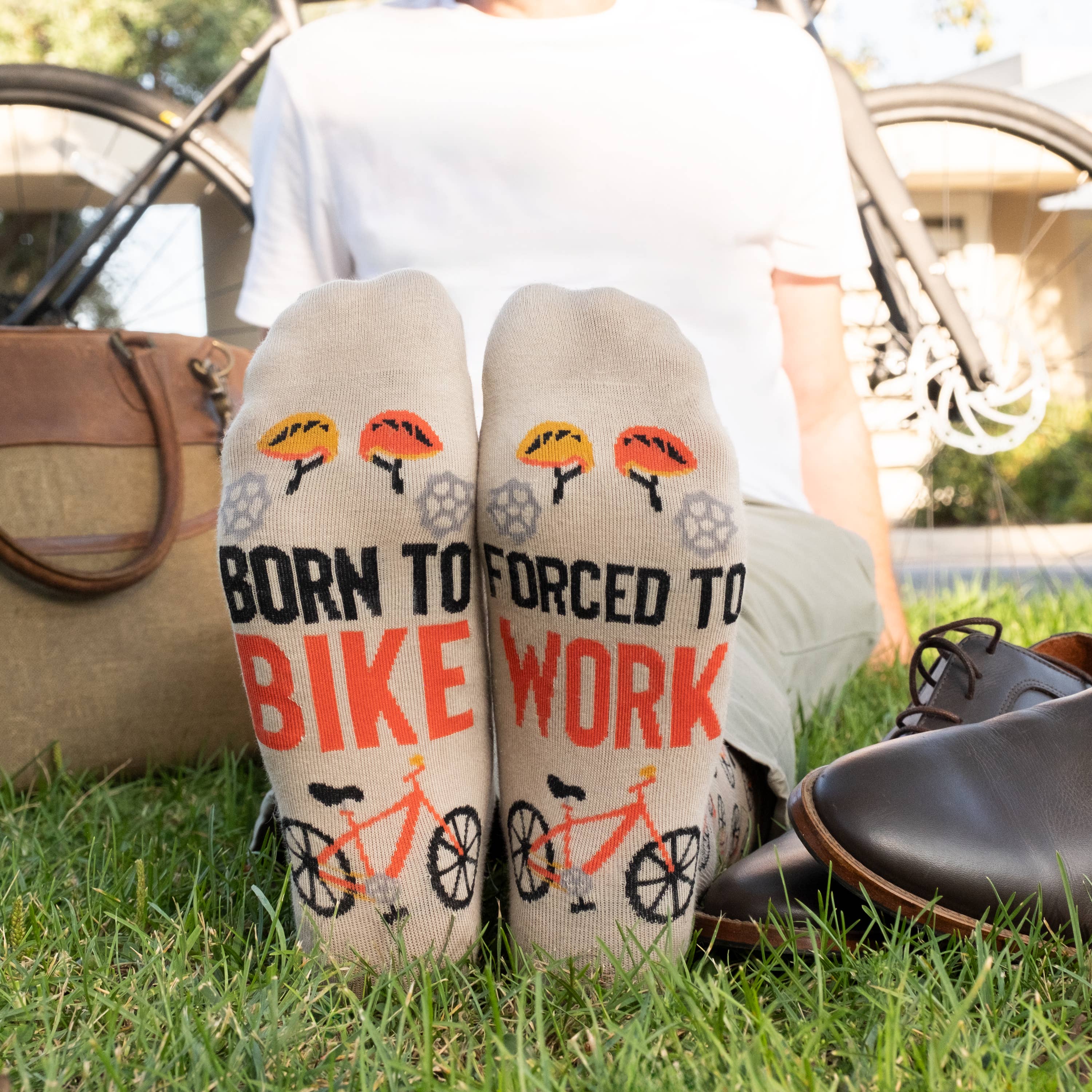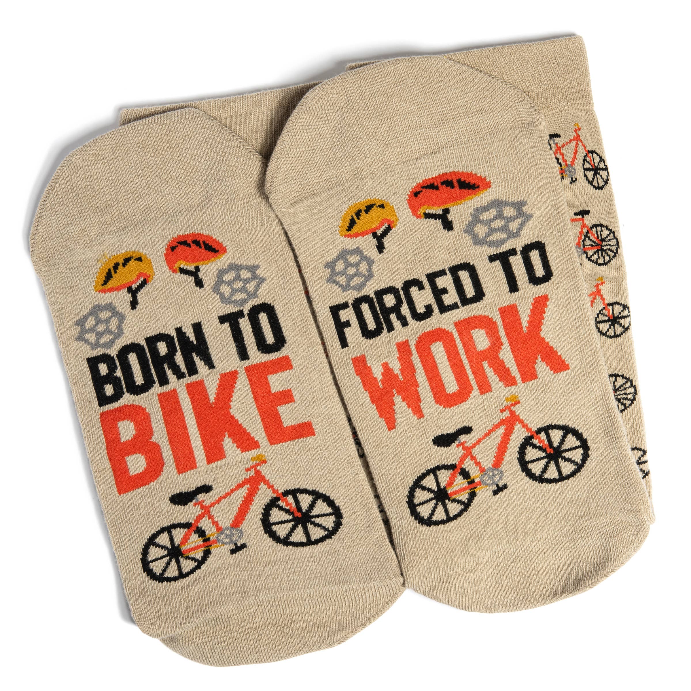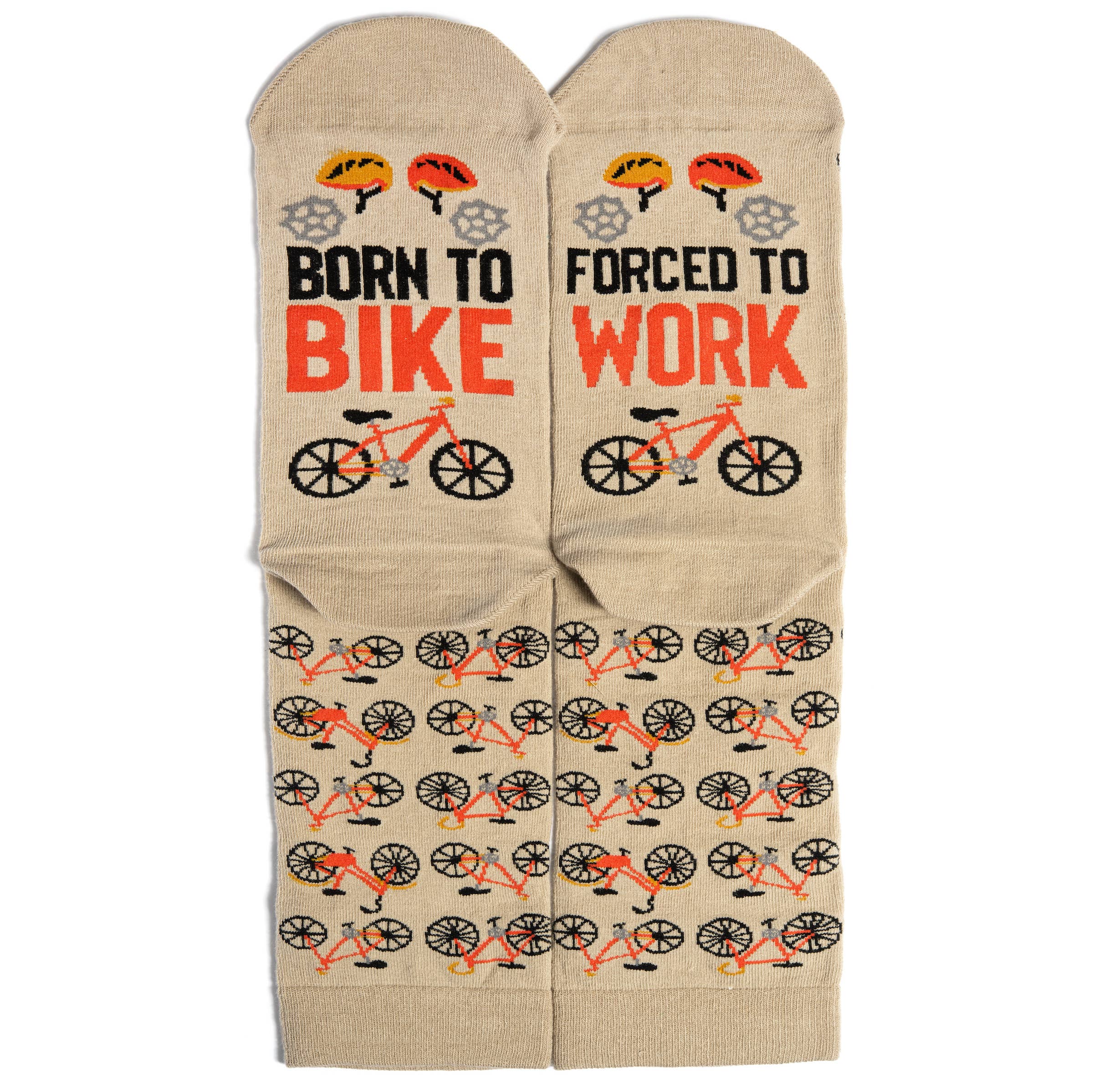 **Product comes packaged half length, unless requested otherwise** Introducing our dapper crew socks designed for cyclists - the perfect blend of style for both work and biking. These socks feature original, unique art with a cool bicycle pattern, and a hidden message that's sure to bring a smile to any bike lover: "Born to Bike, Forced to Work." These fun socks make a wheelie awesome gift for cyclists and bike enthusiasts on their birthday, Christmas, or any special occasion. Whether they're on a bike ride, at the office, or simply unwinding at home, these socks will be a cherished reminder of your thoughtful gesture. PRODUCT DETAILS: * Crew Length * One size fits most (U.S. Men's size 6-13, Women's size 7-11) * 62% Combed Compact Cotton, 35% Nylon, 3% Spandex * Machine wash cold. Tumble dry low. Do not iron. ST