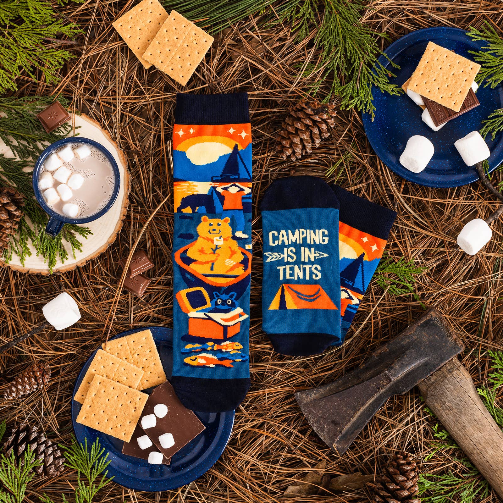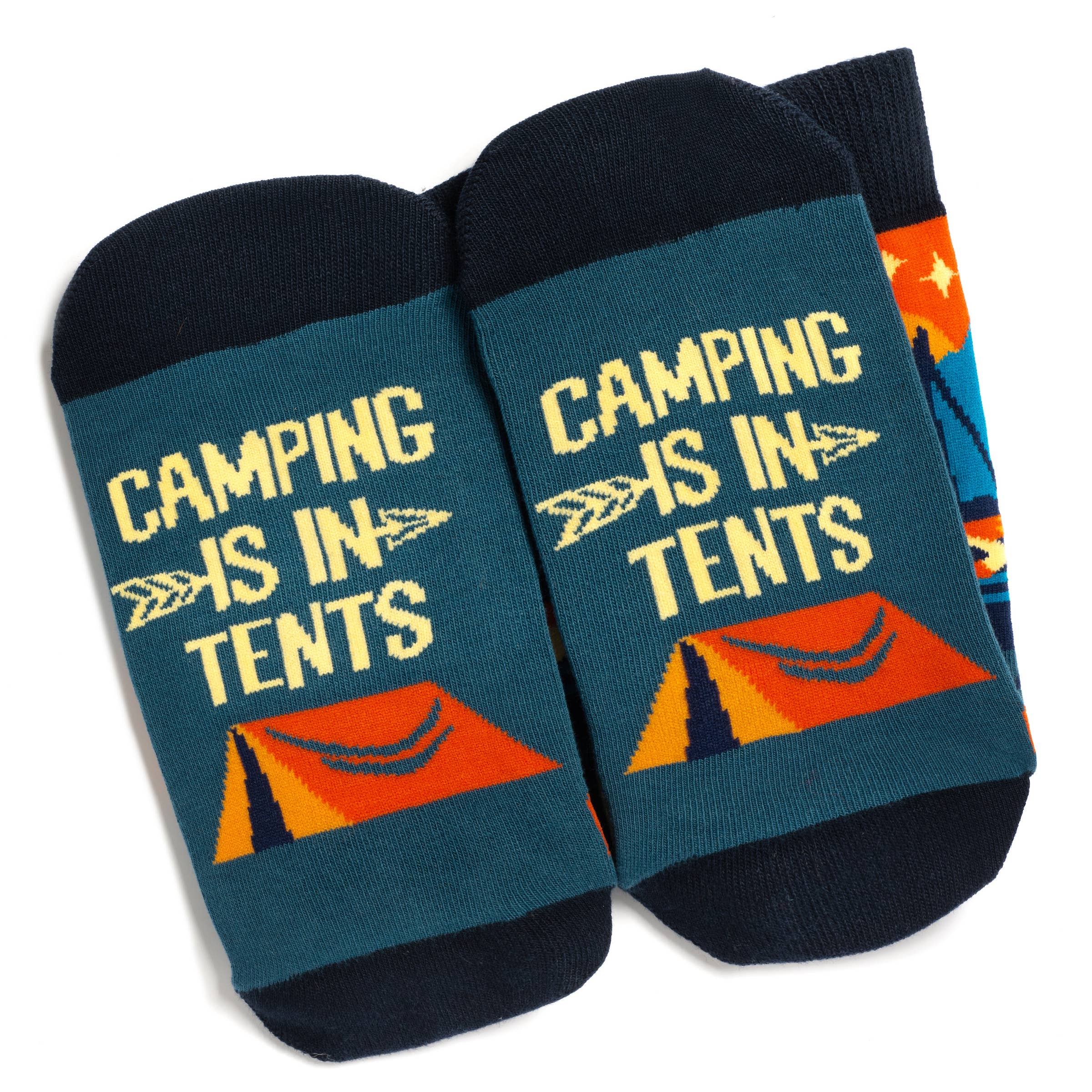 Get ready to show off your love for camping in the most fun and fashionable way possible! These hilarious camping themed socks are designed to bring a smile to the faces of camping enthusiasts everywhere. Whether you're a seasoned camper or just love the idea of sleeping under the stars, these socks are perfect for you. With the funny saying "Camping Is In Tents" boldly printed on the soles, these socks are sure to be a hit. The colorful camping scene on the socks will transport you to the great outdoors, even when you're stuck indoors. Whether you're sitting around the campfire, hiking through the woods, or simply dreaming of your next adventure, these socks will keep your feet cozy and stylish. PRODUCT DETAILS: * Crew Length * One size fits most (U.S. Men's size 6-13, Women's size 7-11) * 62% Combed Compact Cotton, 35% Nylon, 3% Spandex * Machine wash cold. Tumble dry low. Do not iron.