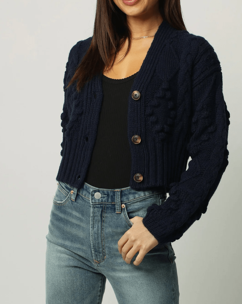 Long sleeve cardigan sweater, pointelle design cable yarn knit accessorized with horn pattern buttons. Ever reliable staple for the warm autumn comfort, ready for any mood. Solid color yarn on relaxed fit.