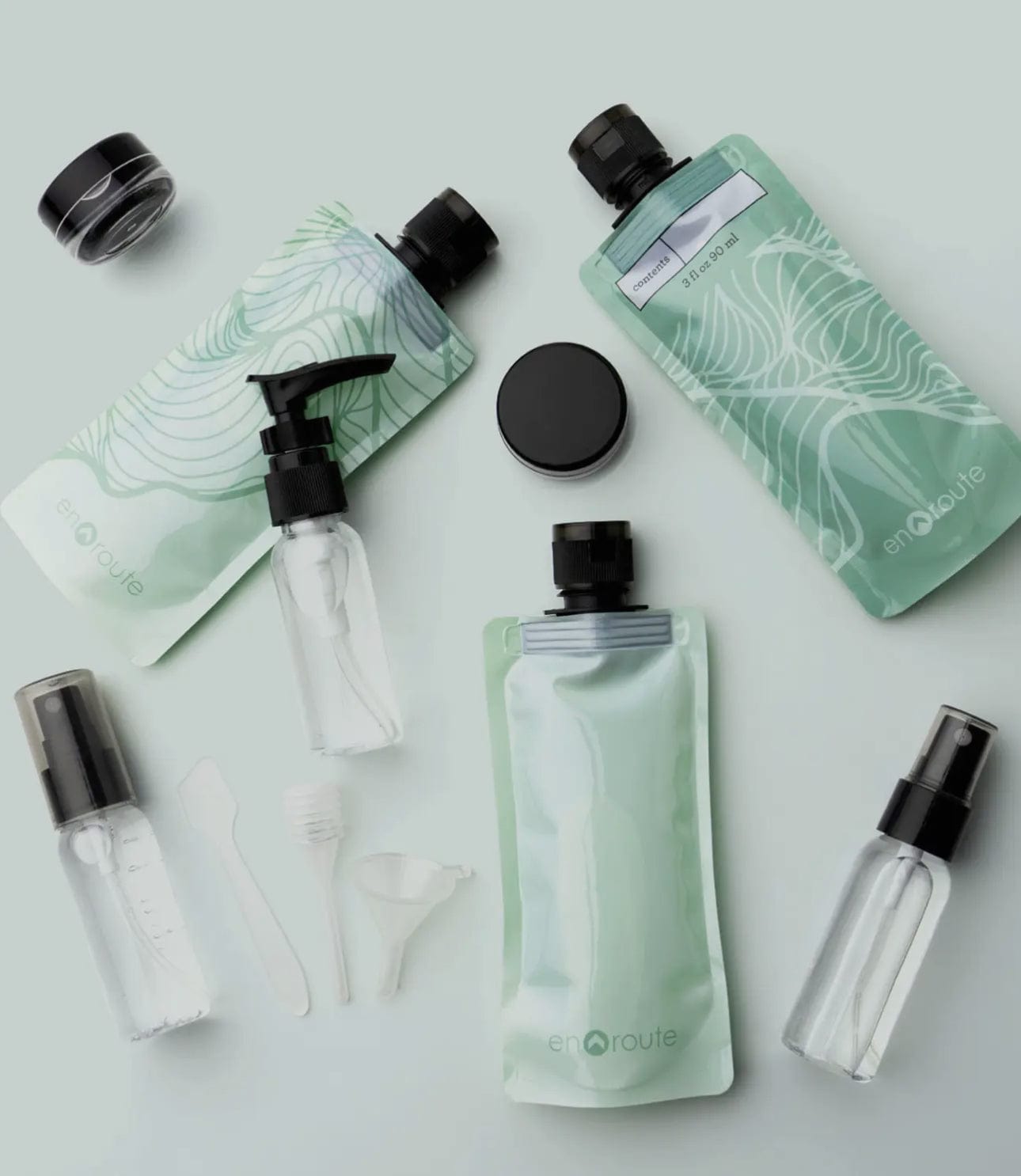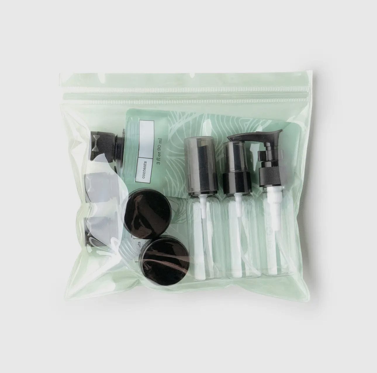 Complete travel set with 11 pieces total Great for gym days, weekend stays and mile high getaways Reusable and eco-friendly TSA friendly BPA free Total set includes: - 3 squeeze pouches (3 fl oz) - 2 spray bottles (1fl oz) - 1 pump bottle (1 fl oz) - 2 mini jars (0.33 fl oz) - 1 mini dropper - 1 mini funnel - 1 mini scraper