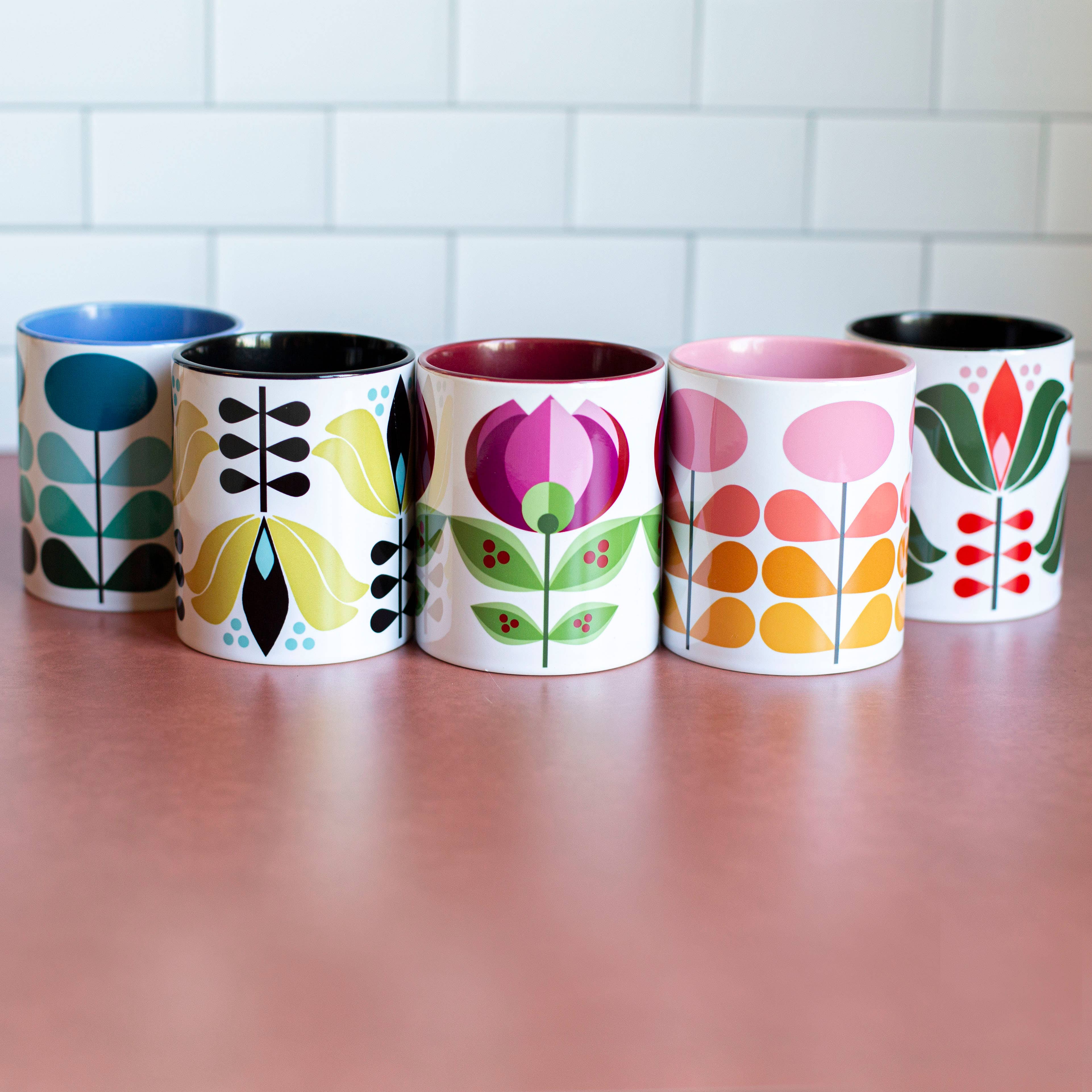 Enjoy your favorite morning brew in timeless style with the Mid Century Tulip Flower Coffee Mug. This beautifully crafted mug features a mid-century modern tulip design in a stunning shade of purple. Rekindle your love of retro fashion with a timeless accessory! Ceramic mug with contrasting inside and handle coloring 11 oz mug Dishwasher and microwave safe