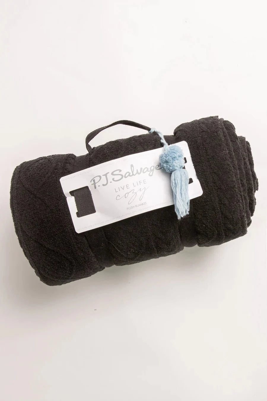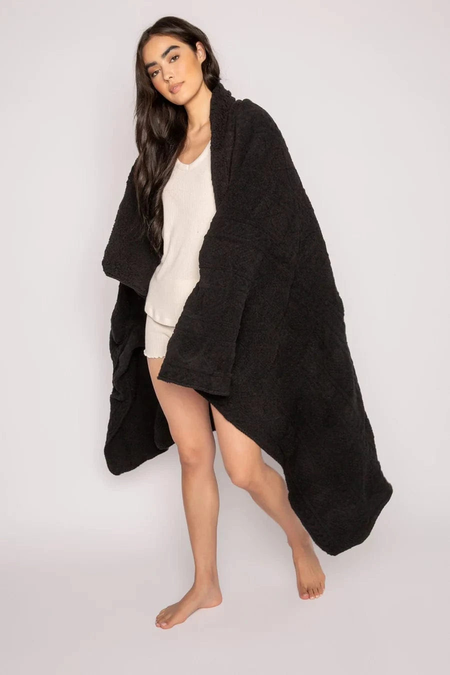 DESCRIPTION: Cuddle up in a cozy, multi-textured experience. Luxe cable-knit in ivory or black reverses to ivory or black faux fur. A way to treat yourself, or makes a winning gift for any occasion of the year. Personal size, comes rolled in a handy carry strap.
