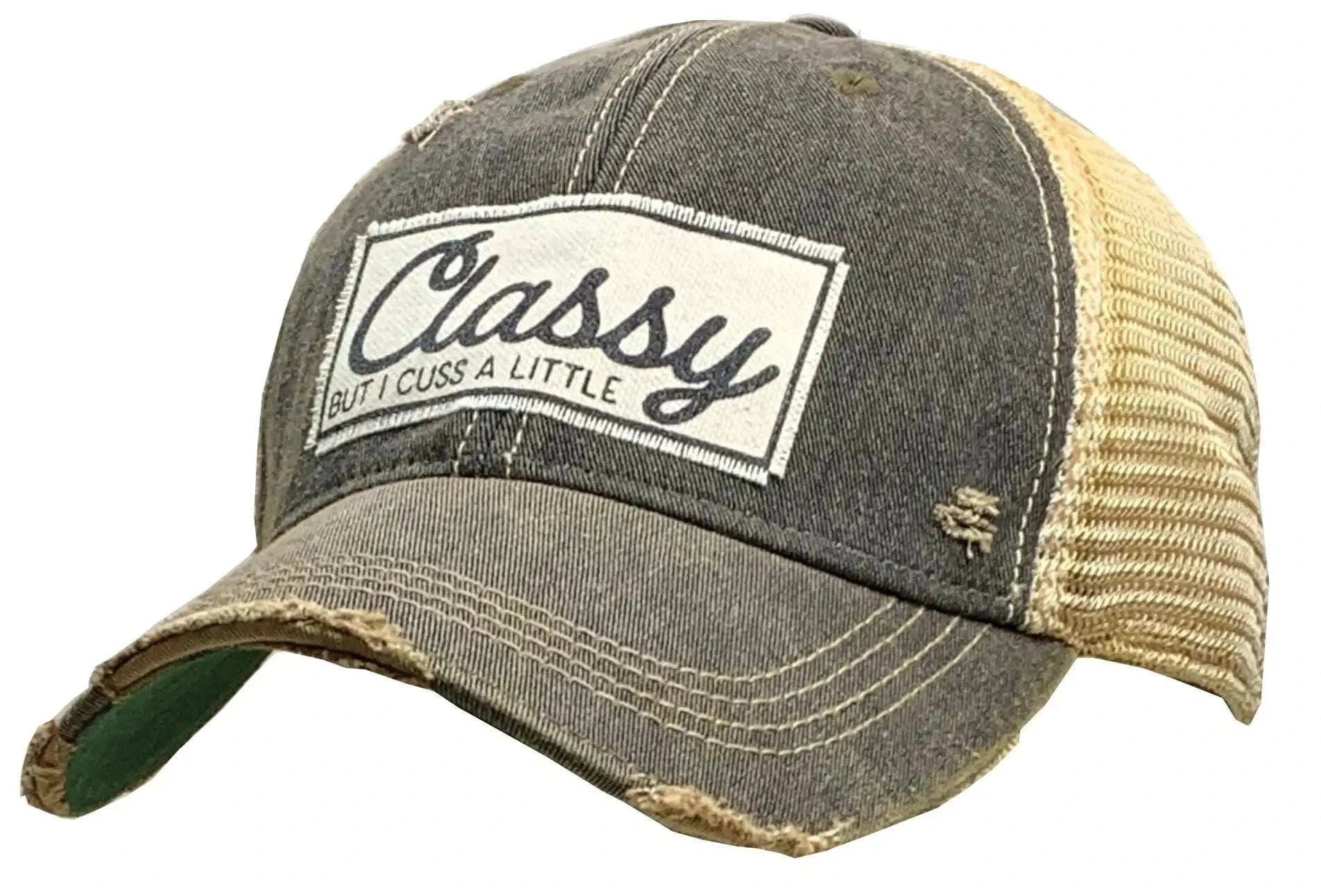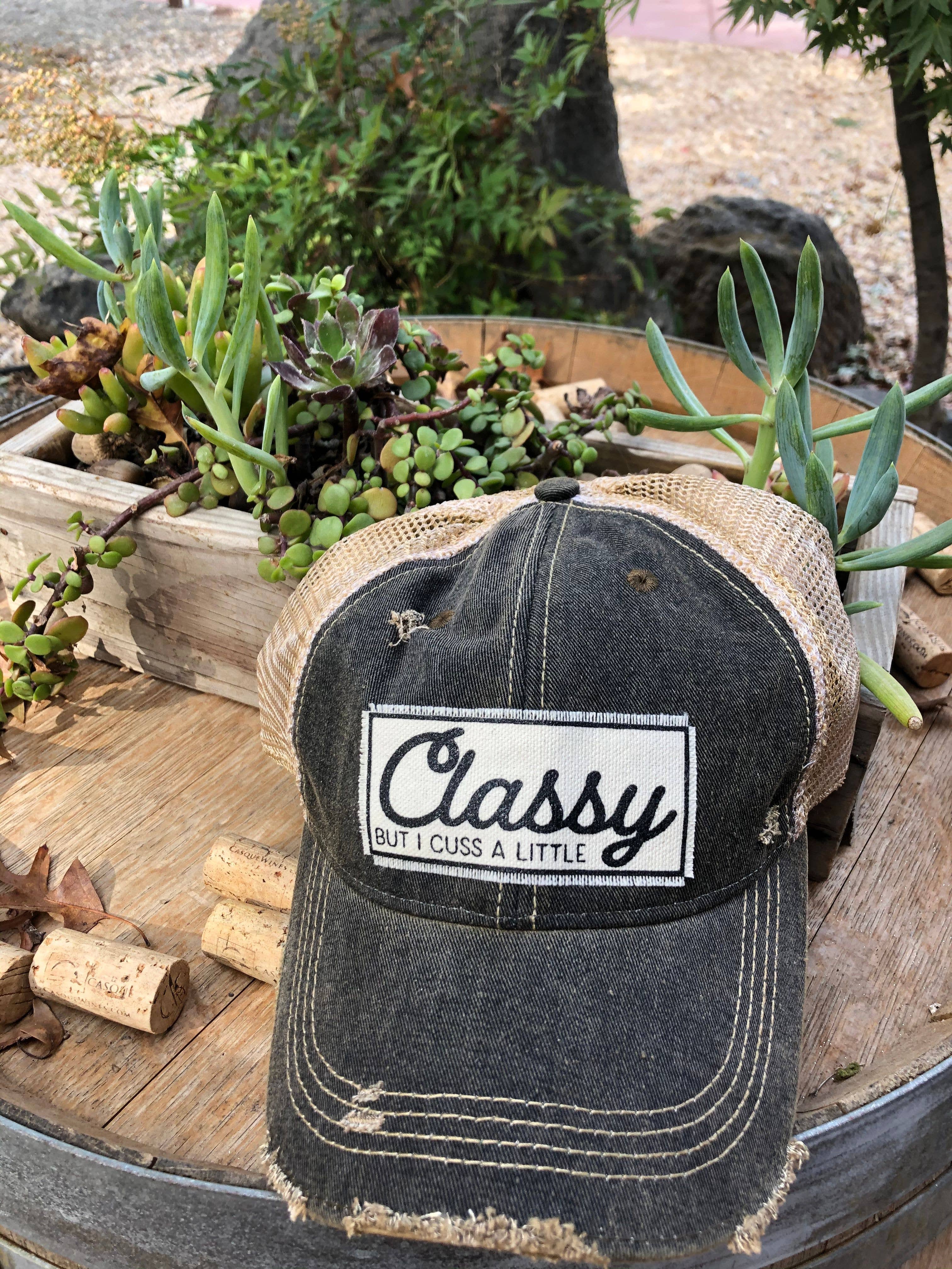 Vintage distressed trucker cap "Classy But I Cuss A Little". Color: Black Material: cotton/polyester blend, mesh back. Size: One size fits most, with an adjustable snapback strap. Unisex cap.