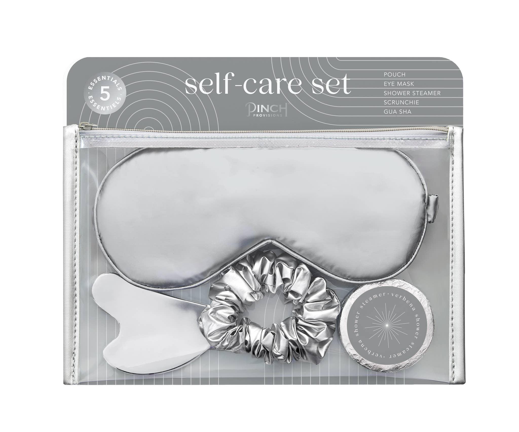 This 5-piece Self-Care Set by Pinch Provisions has it all: luxury, value, and a thoughtful assortment of “me-time” must-haves. The clear zipper pouch with silver vegan leather trim contains a unique combination of shiny self-care essentials: silver sleep mask (with silky backing), silver gua sha, silver scrunchie, and a eucalyptus shower steamer.