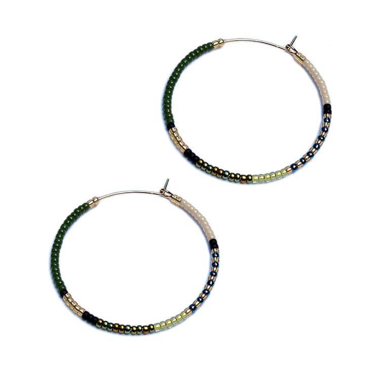 Playful + colorful beaded hoops. Available in 2 endlessly wearable sizes. From spring to fall color vibes. Small hoop 1" in diameter, Large hoop 2". Glass beads, gold-plate Made by artisans in Guatemala
