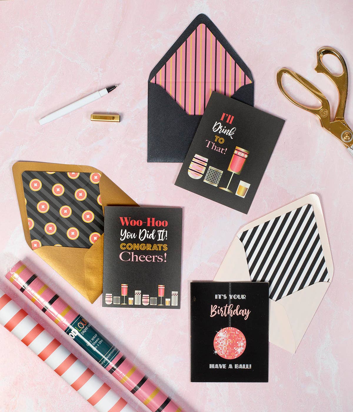 Say congrats with this greeting card inspired by pink-hued vintage cocktails. The glam metallic antique gold envelope and coordinating liner will bring a smile to their face for sure! Great for college grad, retirement, or other life accomplishments. Coordinating geometric envelope liner. Euro flap antique gold envelope included. Made in the USA. Wrapped in a cello sleeve for protection.