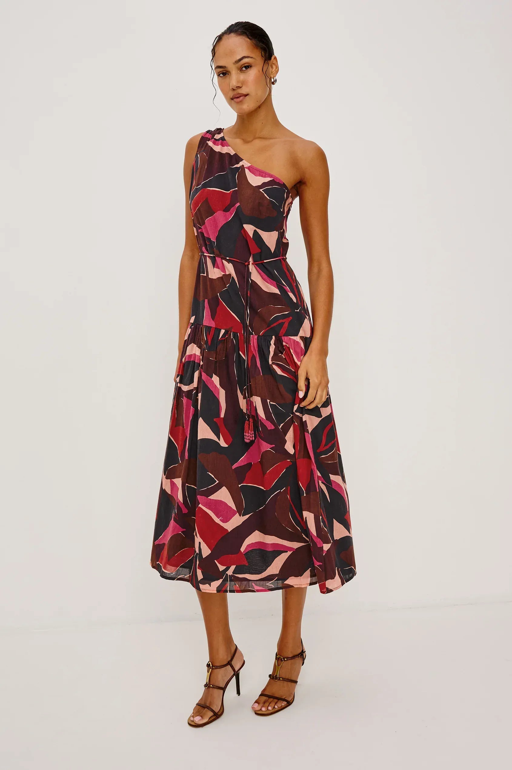 The Cecile features a lively abstract print, a timeless one-shoulder neckline, adjustable waist-defining ties with beaded tassels, and a dropwaist silhouette that softly flares to a midi hem, fully lined with a side zipper closure.