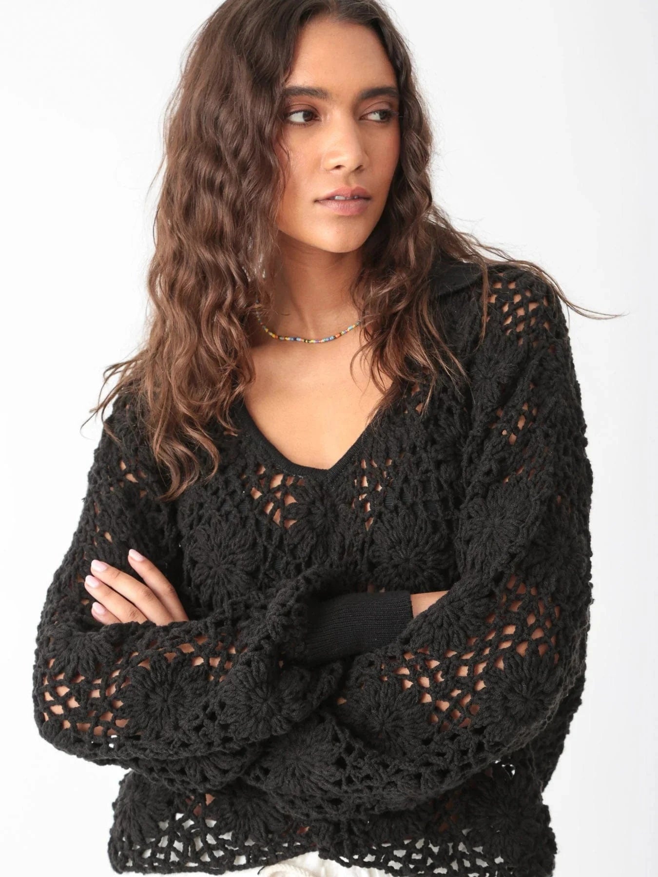 The Vera sweater features a beautiful crochet body with a polo neckline and collar. Dress it up with a vegan leather skirt or dress it down with a pair of Easy pants or denim.