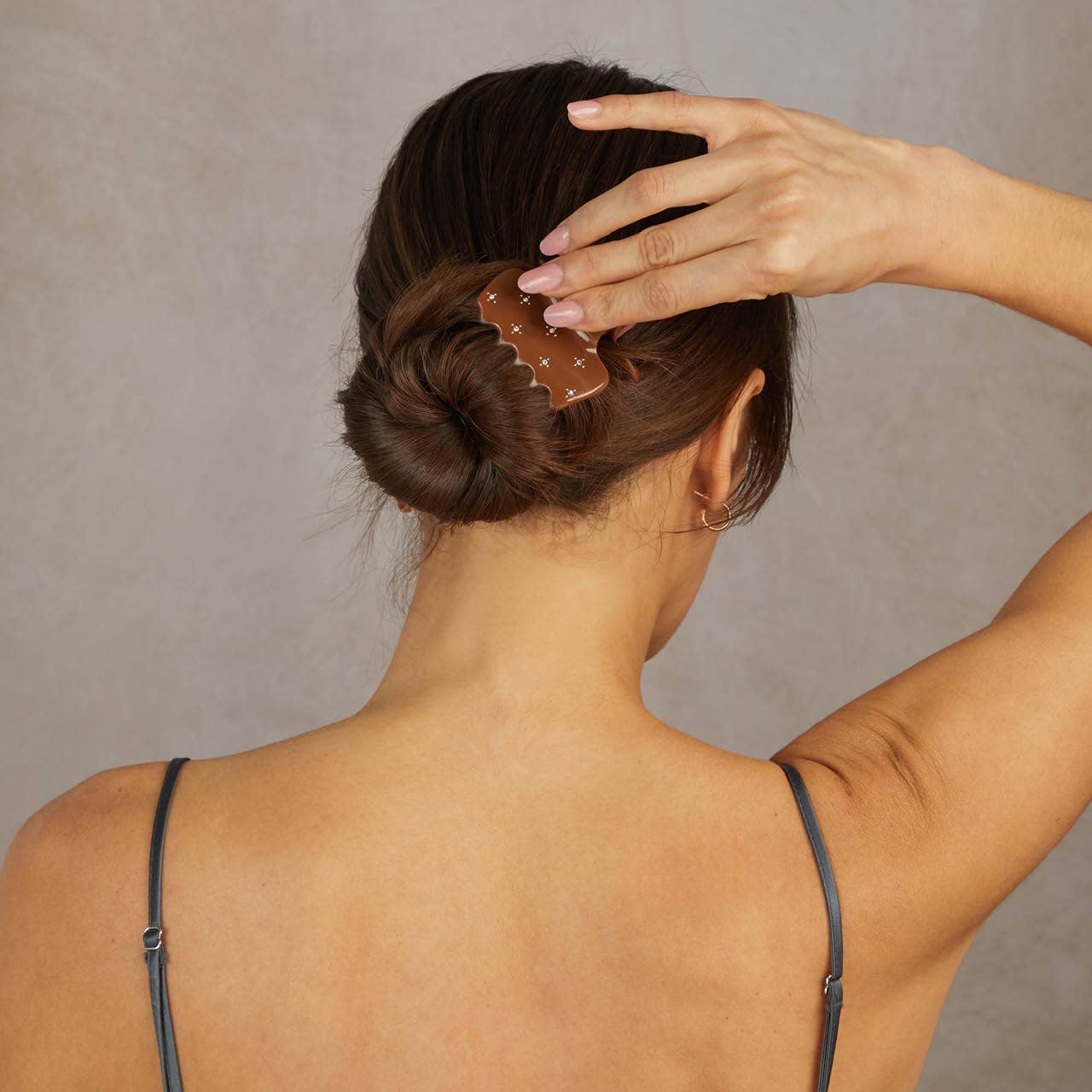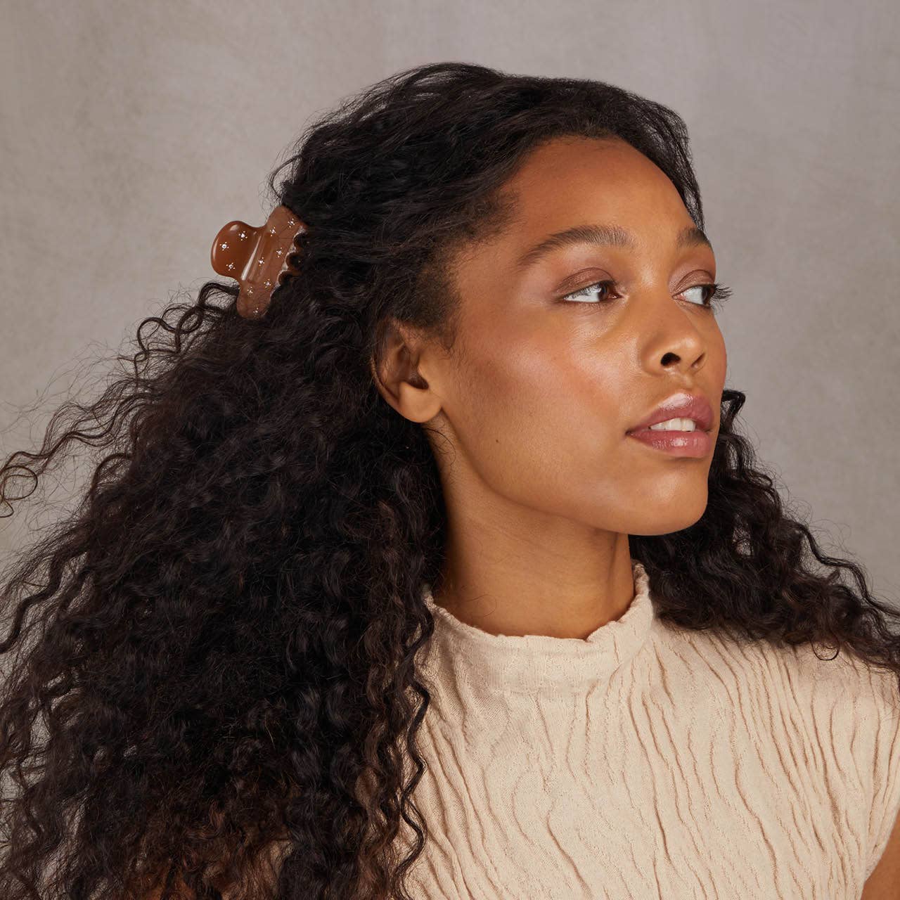 -Easily twist & clip your hair into a half-up or full updo -Medium arch shape comfortably and securely holds most hair lengths and textures -Our very own cloud design with embellished rhinestones & gold studs elevates your hairstyle with added shine -Made from recycled plastic for an eco-friendly, everyday look