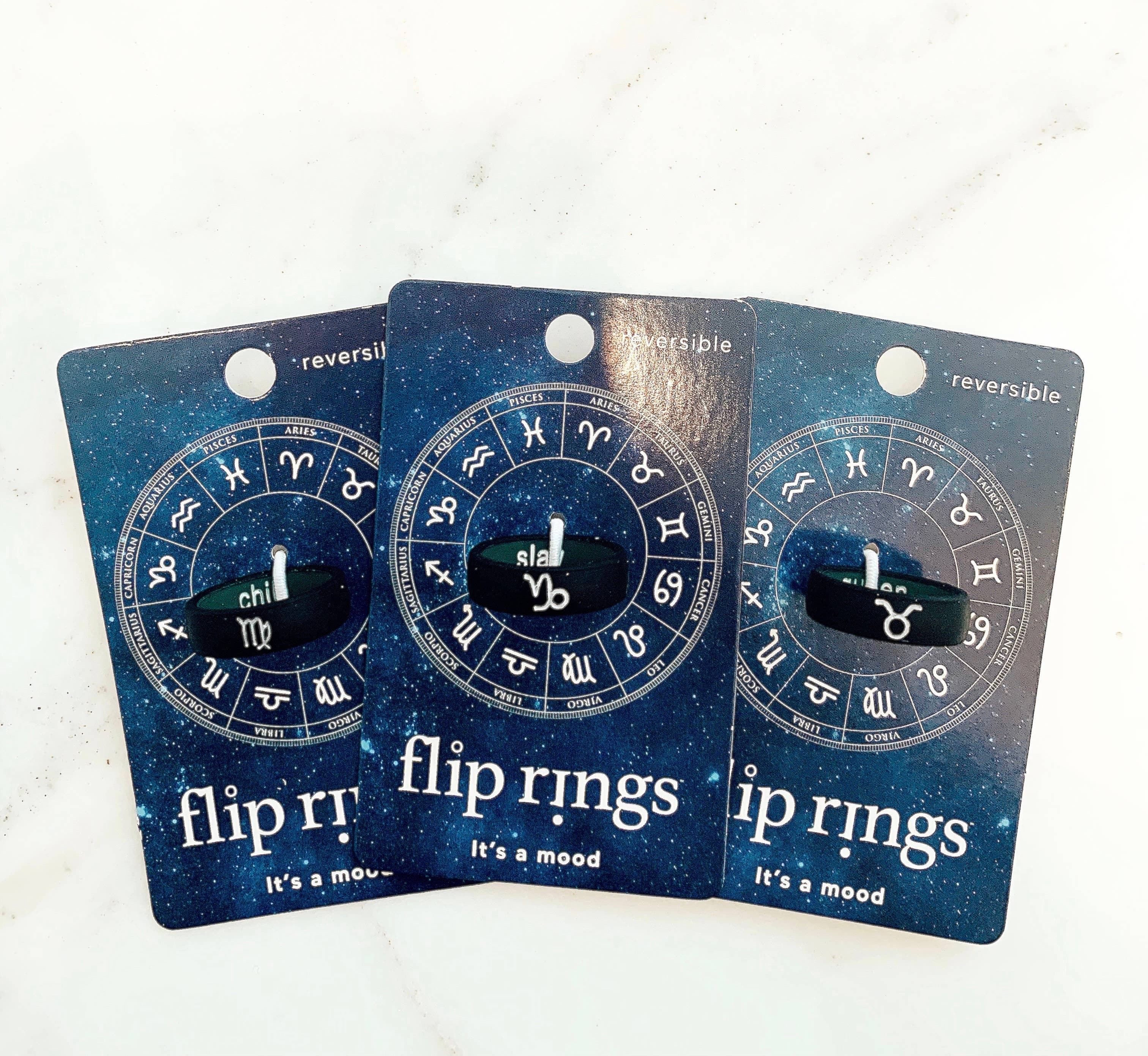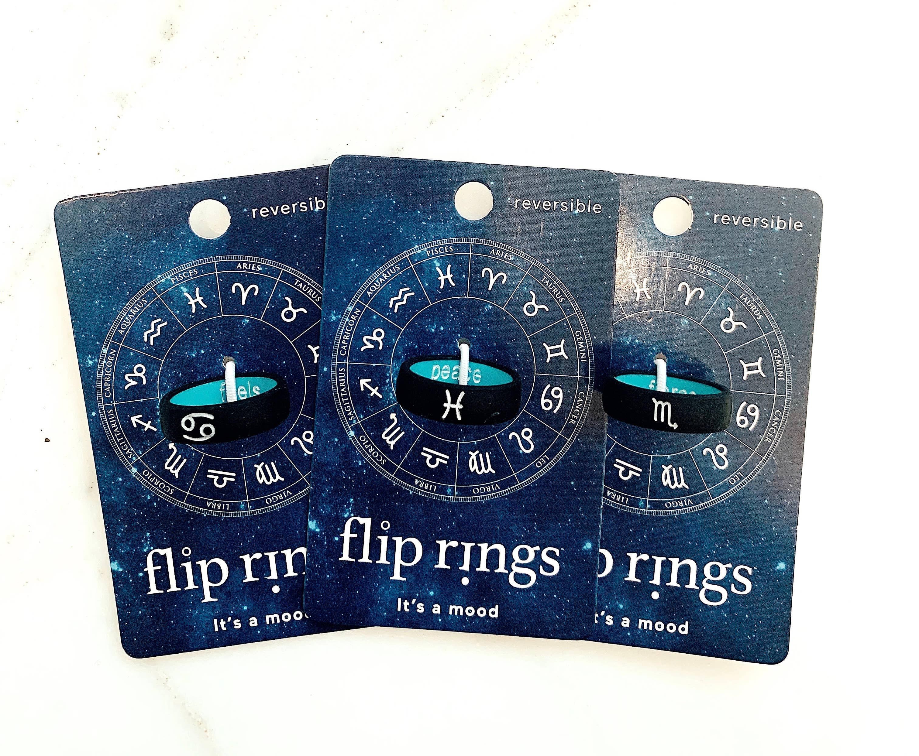 The Zodiac Collection.Each with an etched Zodiac sign and its meaning. FlipRings are medical grade silicone, hypo-allergenic, ultra-comfortable, waterproof, and won't rub off on your skin or clothes. Weight: Incredibly light. Width: 6mm. Thickness: 2mm. Flip Rings are one size. They are designed to fit snug but will stretch and conform to your finger. Technically speaking they are a size 7 (17.2mm diameter) which is the average women's ring size in the U.S. Not sure what your ring size is - it doesn't matter. Wear them on any finger, thumb or even toes. It's all good.