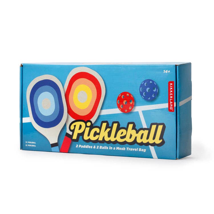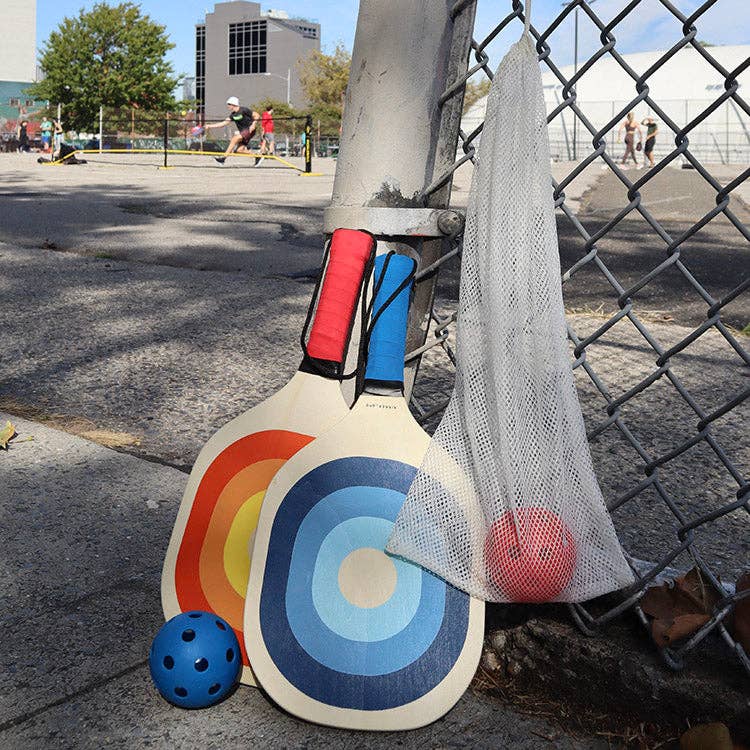Singles game set. Played indoors or outdoors on a badminton-sized court with a slightly modified tennis net. Combines the elements of ping-pong, badminton and tennis. Enjoyed by all ages at any skill level. Includes: 2 paddles, 2 balls & mesh carrying bag. , Design: KDT , Material: poplar wood