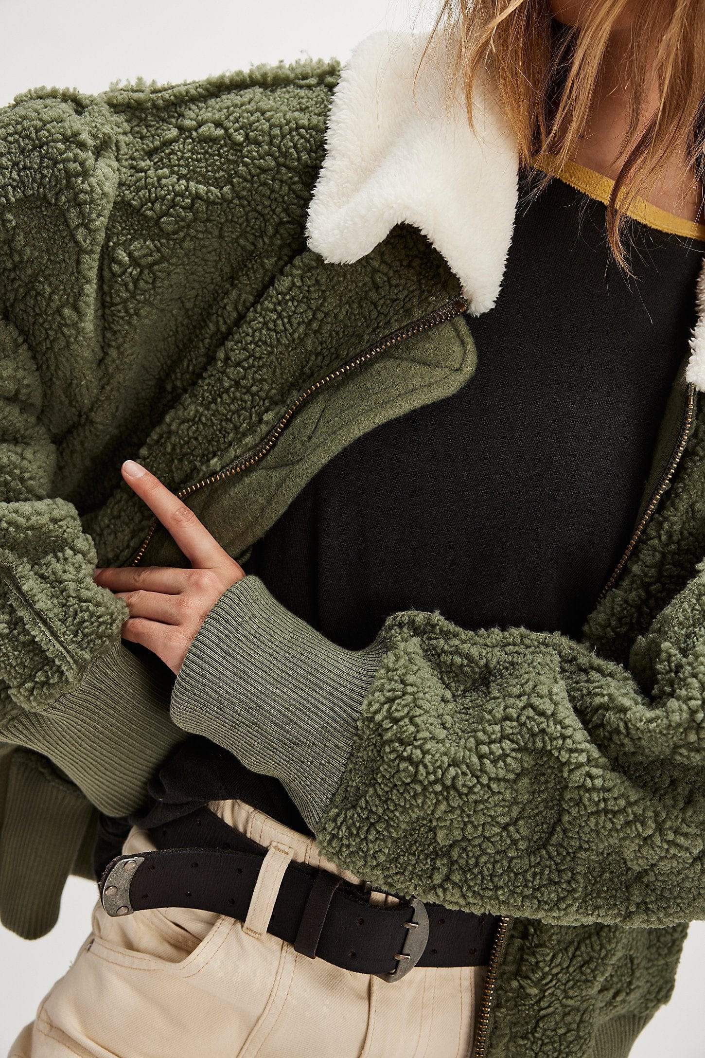 Features: Cozy sherpa fabrication, exaggerated collar, front-zip closure, drop-shoulder sleeves with elasticated cuffs, ribbed hems, pockets for hands