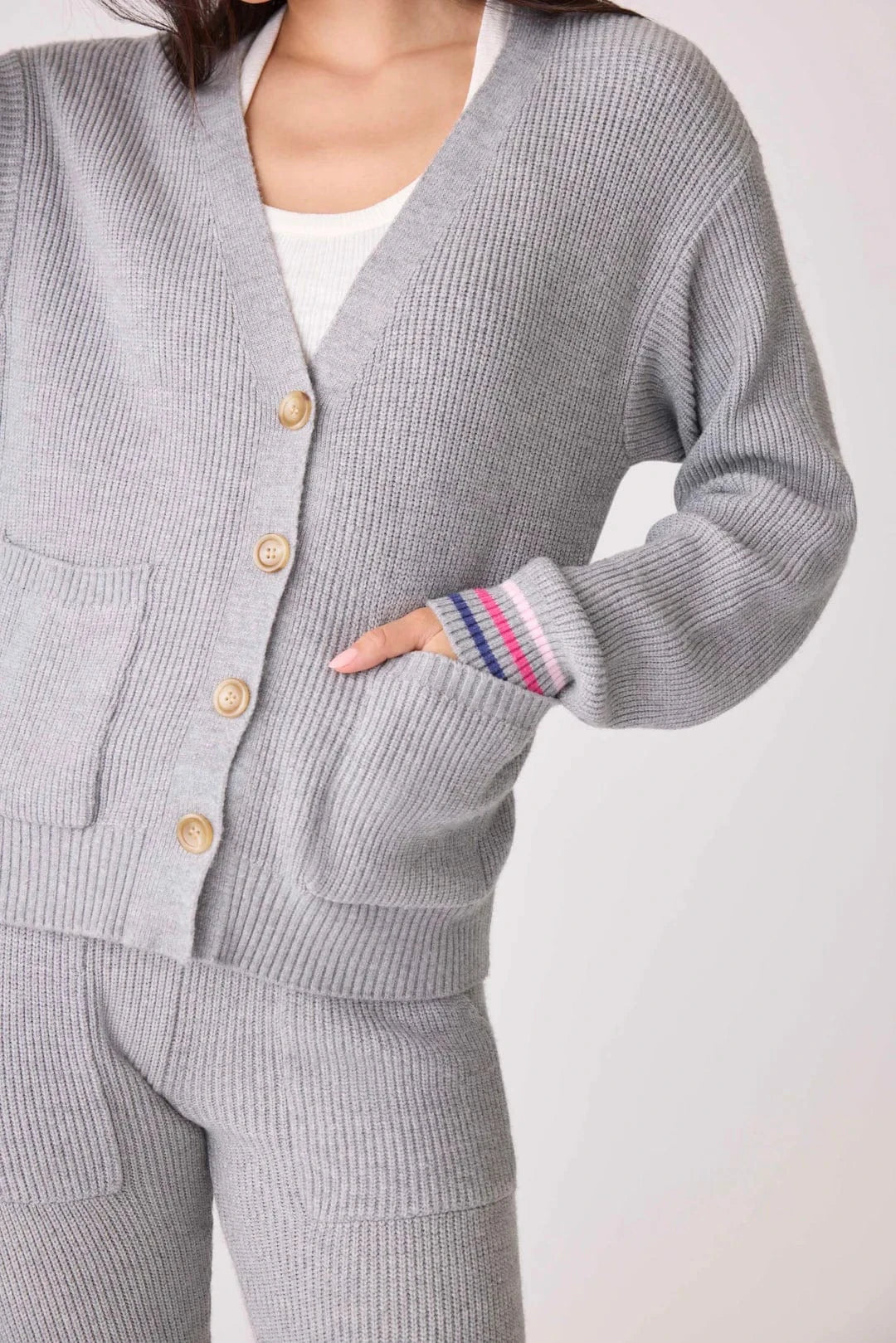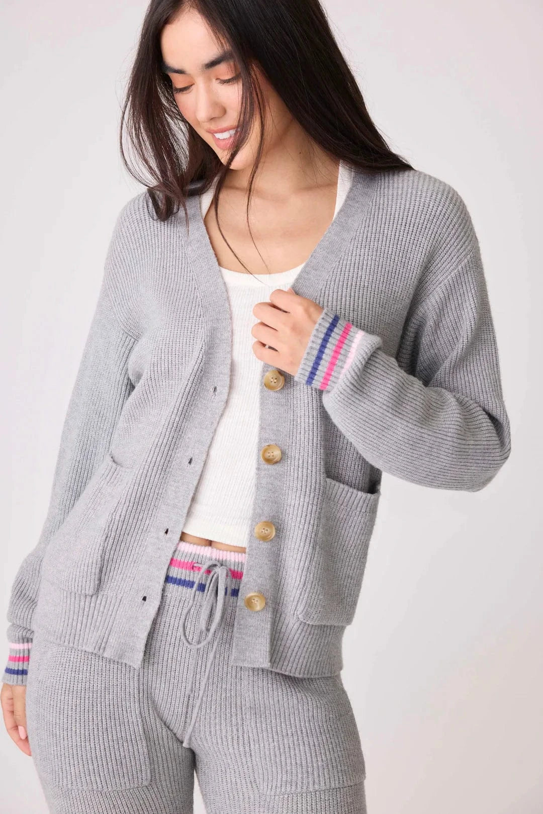 Embrace cozy season in a sweater weather rib knit cardigan sweater. Featuring a classic button front, lower patch pockets, and playful navy and fuchsia striped sleeve cuffs, this sweater is your perfect companion for sweater weather. Crafted for warmth and style, it's ideal for layering on cool days or relaxing at home.