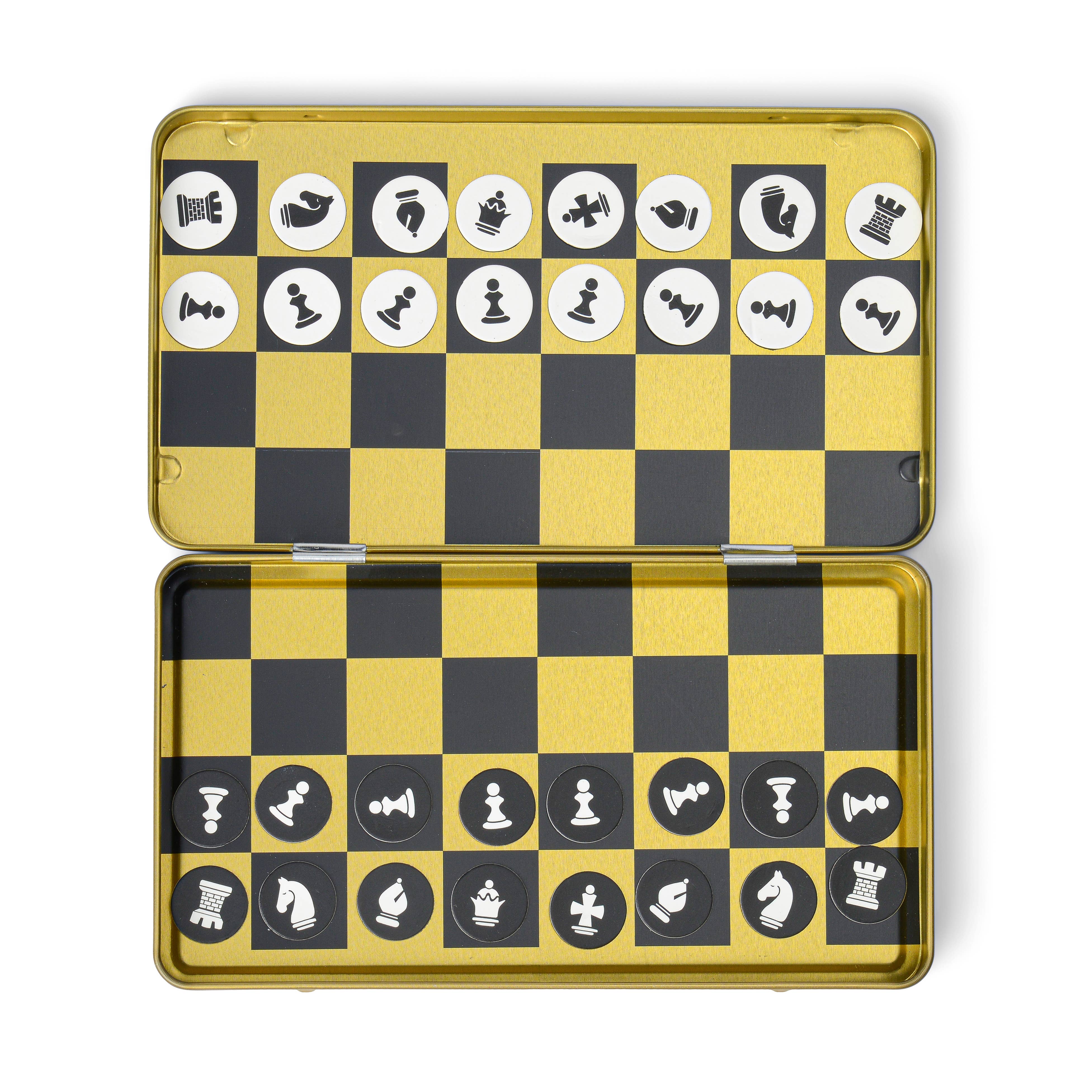 This classic set features the game you love With magnetic pieces making it great for Play on the road or on uneven surfaces. Packaged in illustrated tin. Tin size: 4”w x 7.2”h x .6”d