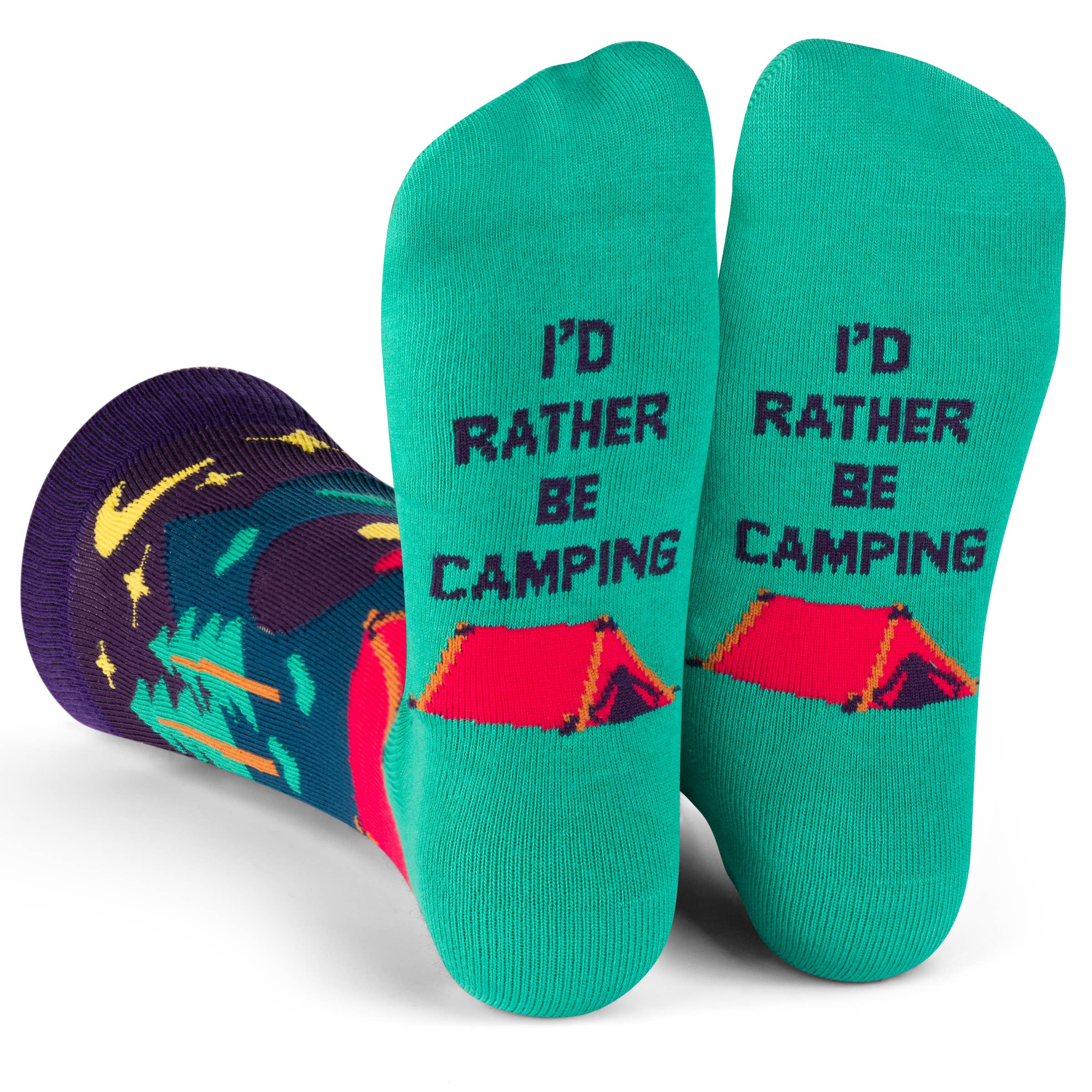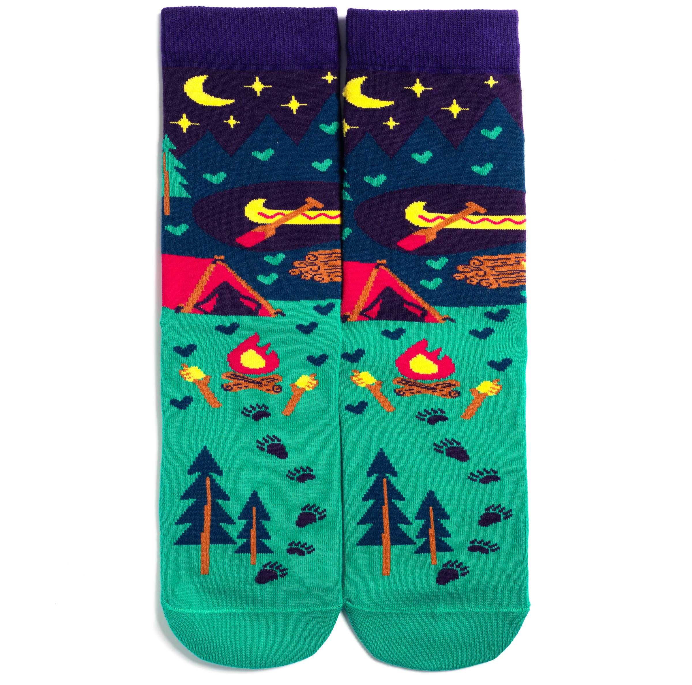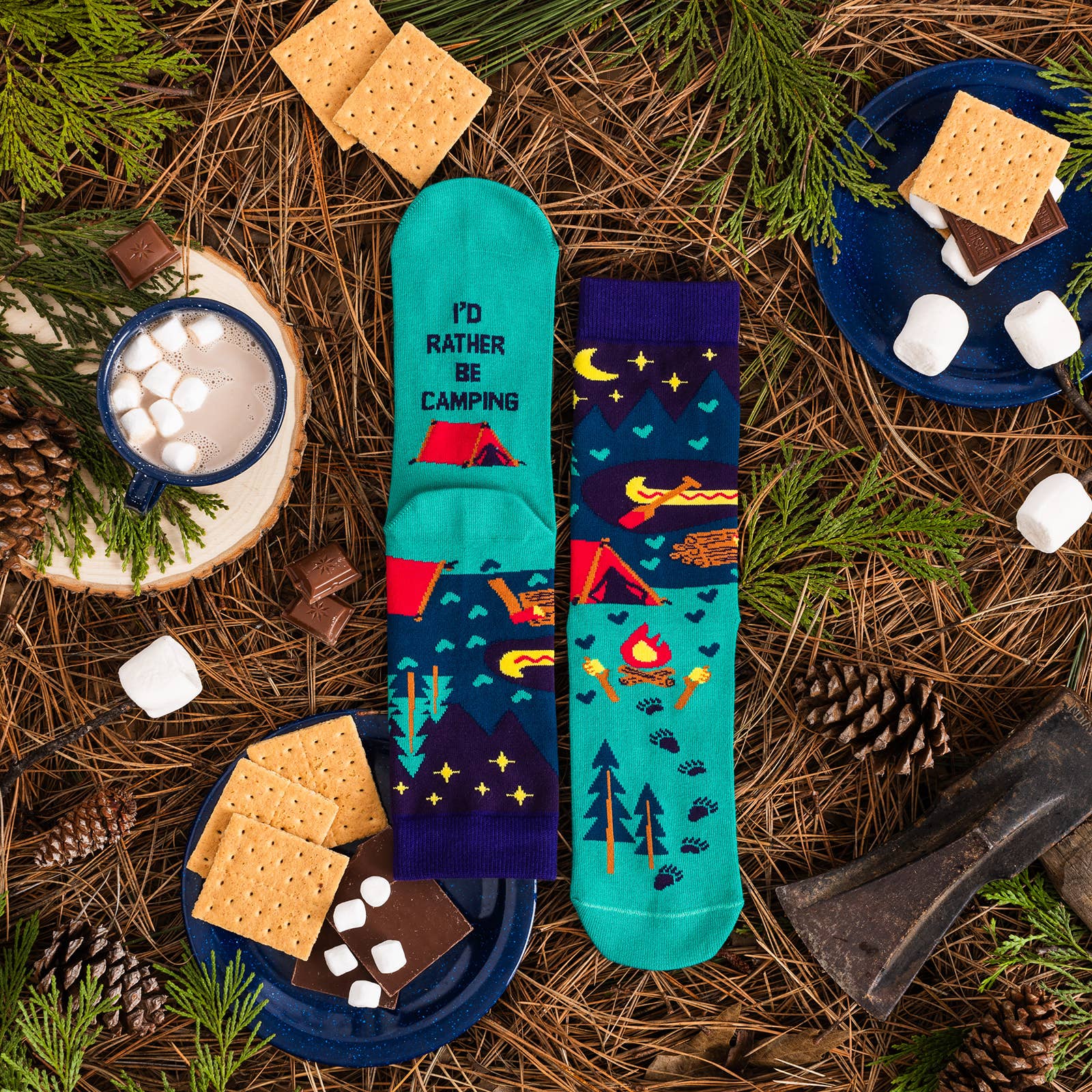 Embrace the great outdoors with these funny camping socks to keep your feet warm and spirits high! The design features a beautiful camping scene complete with bonfire, mountains, lake, canoe, starry night sky and bear prints, while the bottom of the socks showcases a funny saying: “I’d Rather Be Camping.” Any outdoorsy person is sure to love these socks! Perfect for those who enjoy hiking, camping, back-packing and exploring.