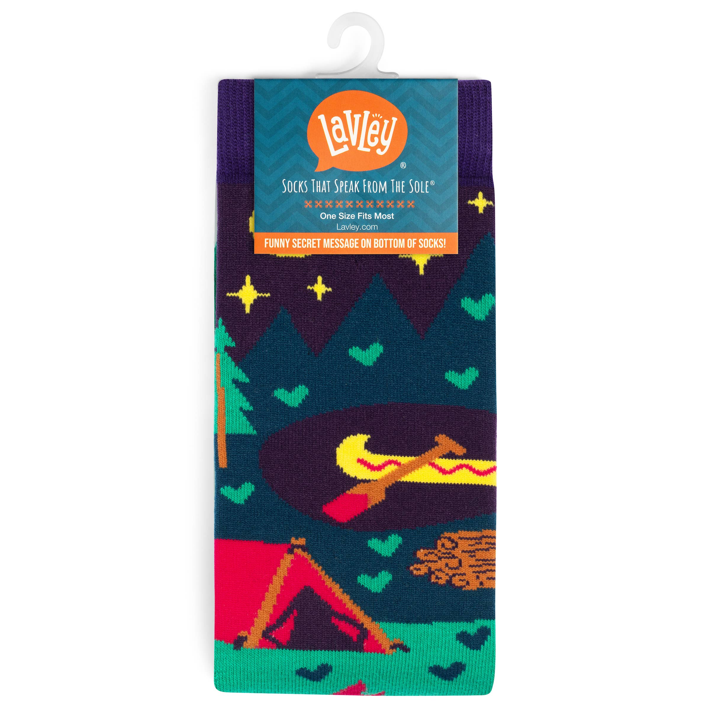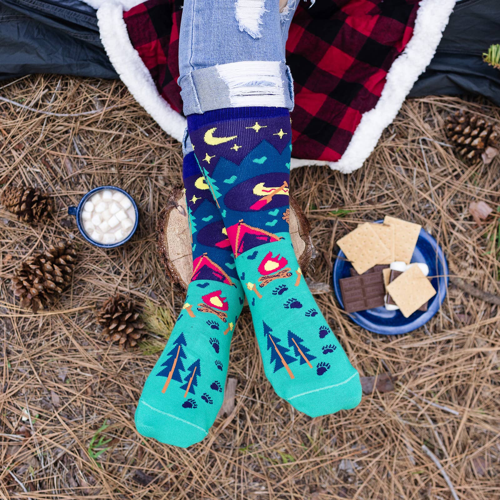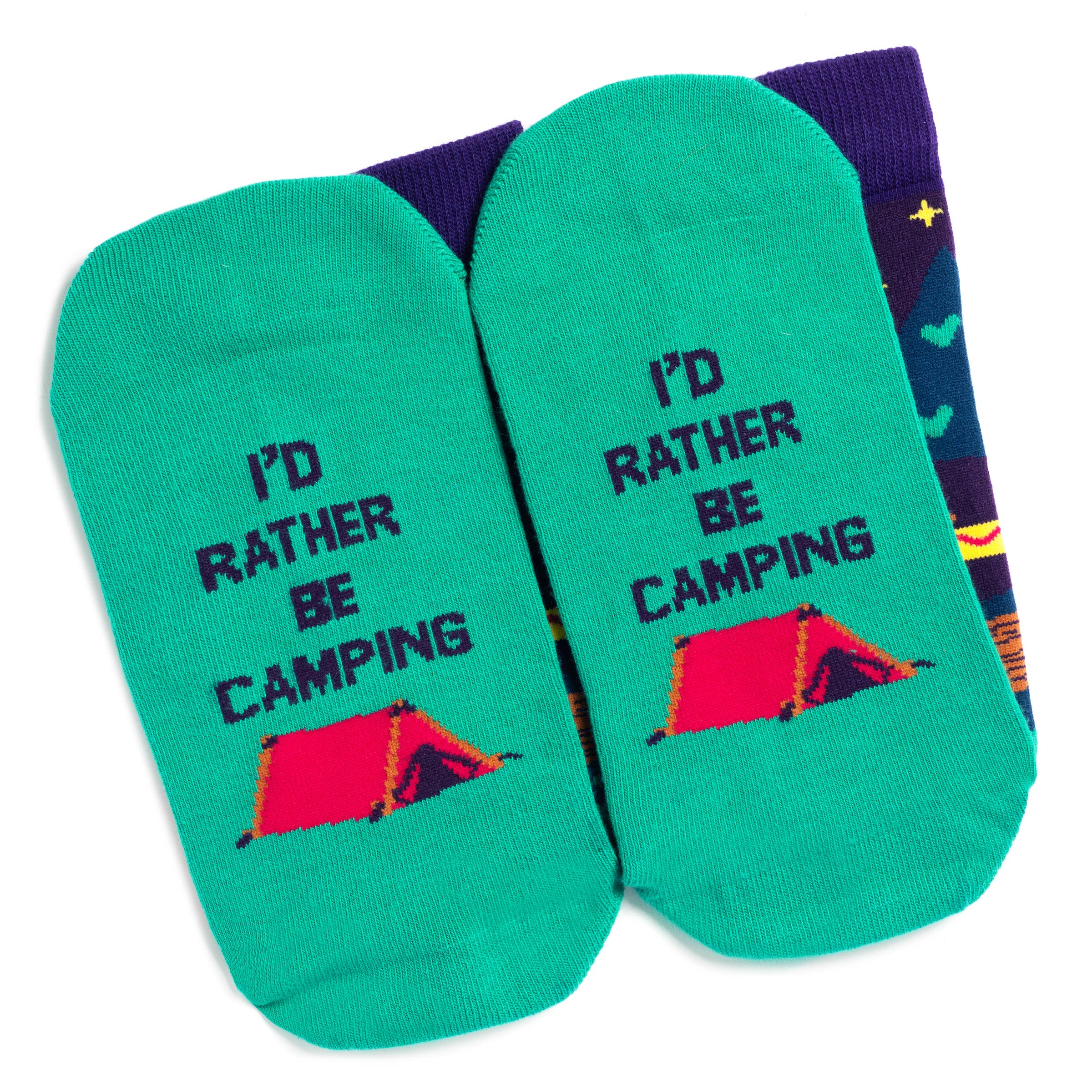 Embrace the great outdoors with these funny camping socks to keep your feet warm and spirits high! The design features a beautiful camping scene complete with bonfire, mountains, lake, canoe, starry night sky and bear prints, while the bottom of the socks showcases a funny saying: “I’d Rather Be Camping.” Any outdoorsy person is sure to love these socks! Perfect for those who enjoy hiking, camping, back-packing and exploring.