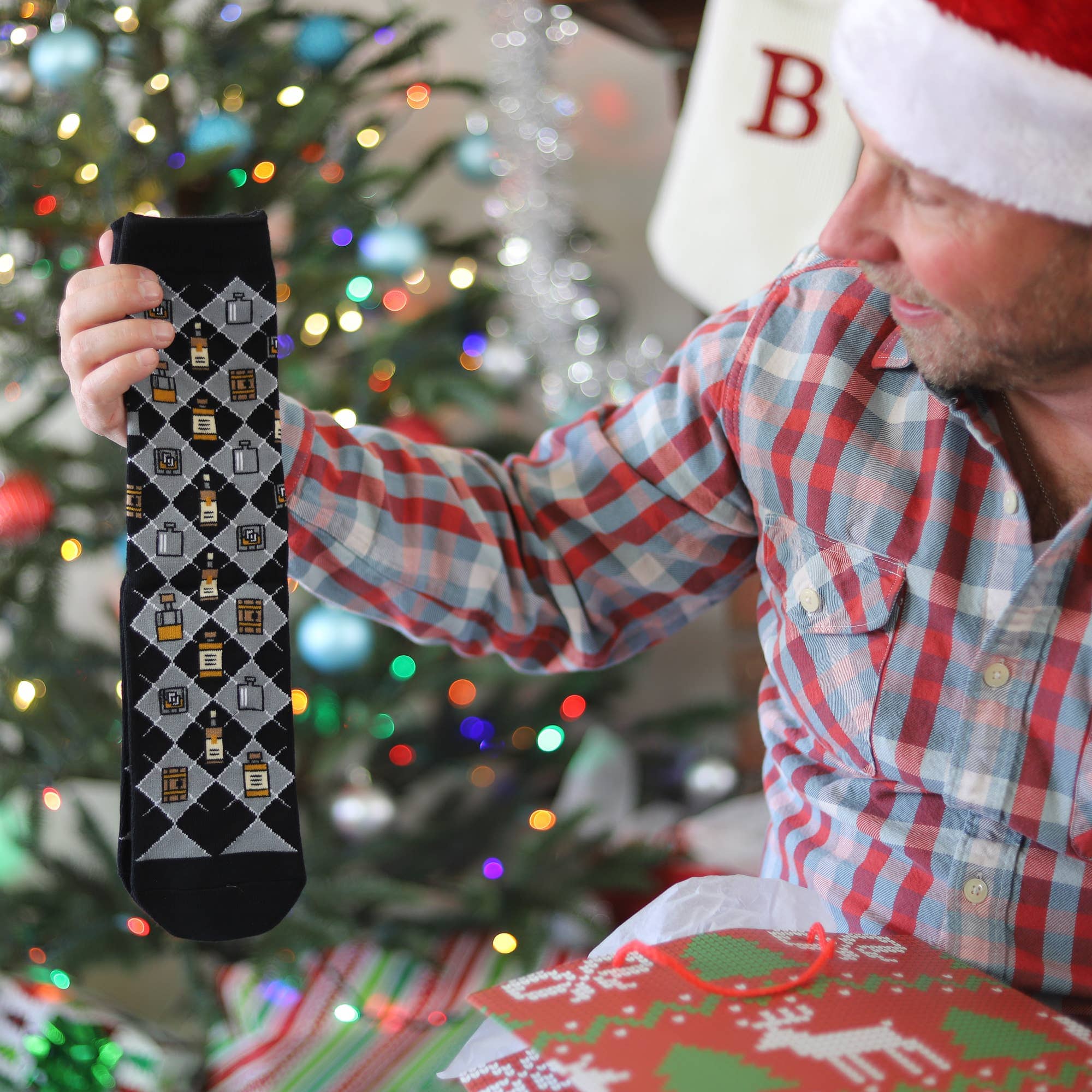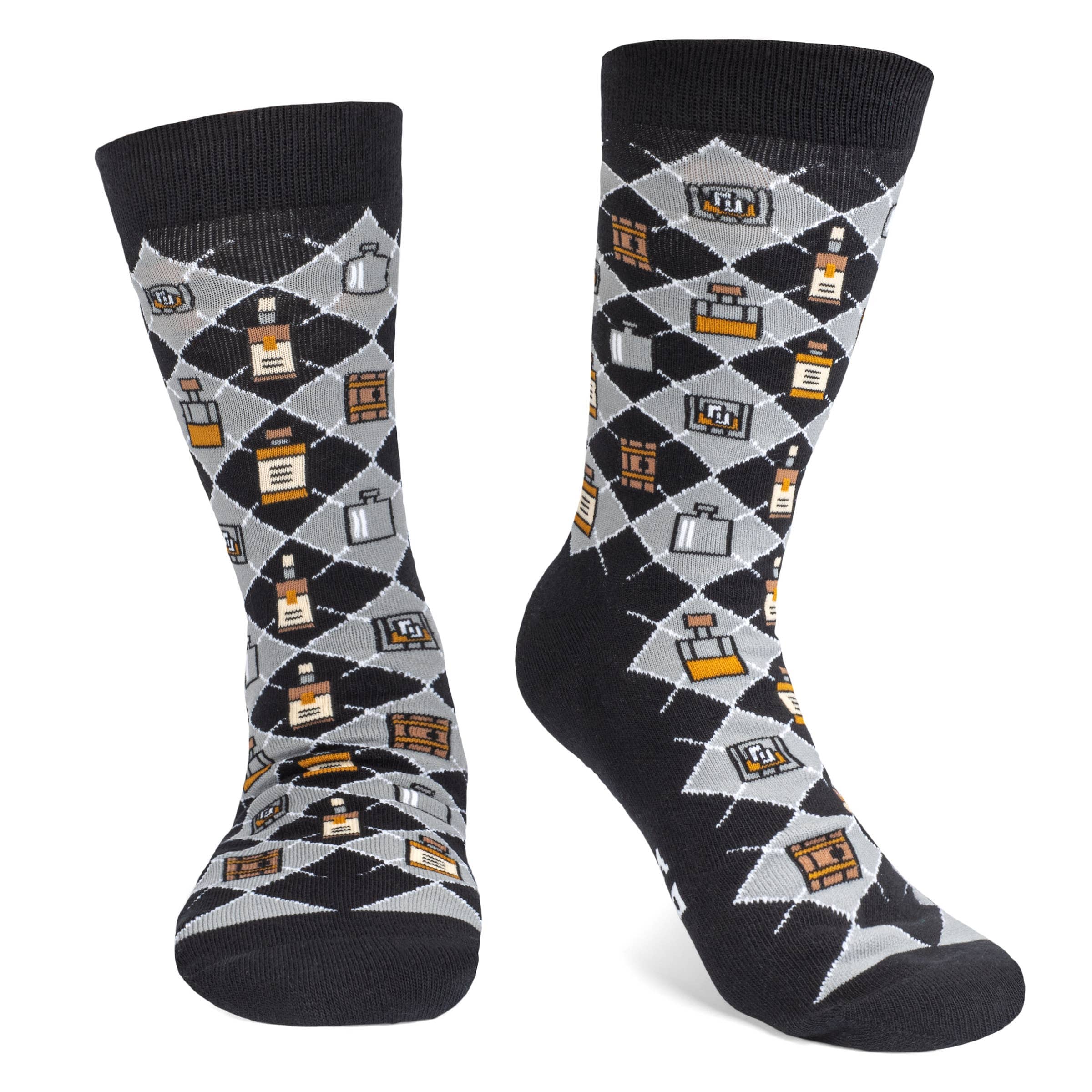 Cool crew socks for whiskey lovers! Featuring a classic argyle pattern, plus original icons that will make whiskey drinkers’ mouths water - bottles, barrels, flasks, and whiskey glasses. They’ll love pouring a glass of their favorite and putting their feet up so everyone can read the secret message on the bottom, “I’d Rather be Drinking Whiskey”. The perfect gift for whiskey, bourbon or scotch lovers! - WH