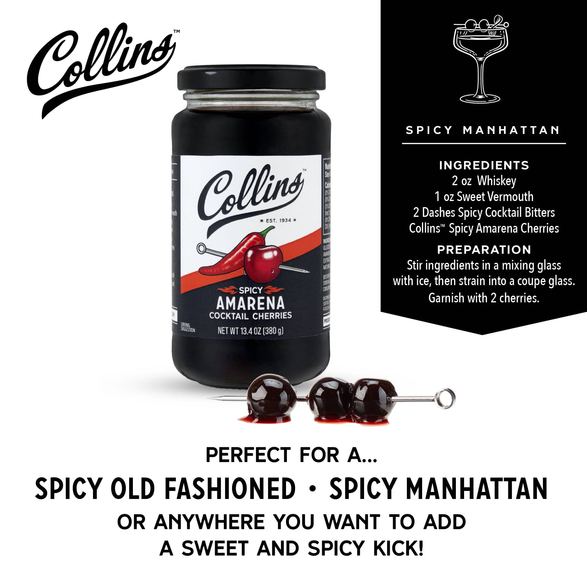 **check out our entire line of Collins mixers, garnishes and more here on Faire** Collins Spicy Amarena Cherries are the perfect way to elevate an Old Fashioned or Manhattan. Crafted from Italian cherries in sour cherry juice, these cocktail cherries have a hint of chili that adds a little kick to your drink. Spicy cocktail cherries 13.4 oz. jar Cherries, Glucose-Fructose Syrup, Sugar, Amarena Juice, Citric acid, Extract of carrot and hibiscus, chili natural flavoring. STEMLESS AMARENA CHERRIES WITH A SPICY KICK– Discover a gourmet jar of Amarena cherries with a little heat. Deep purple, juicy, sweet and spicy, these old fashioned cherries are perfect for those looking for an authentic garnish with a spicy kick. AUTHENTIC AMARENA CHERRIES FROM ITALY – Perfect for adding the finishing touch, these spicy Amarena cherries are a delicious garnish for Old Fashioneds, Manhattans, and many other cocktails. Italian cherries in sour cherry juice gain some heat from chili.