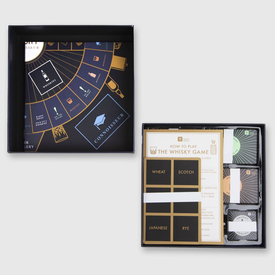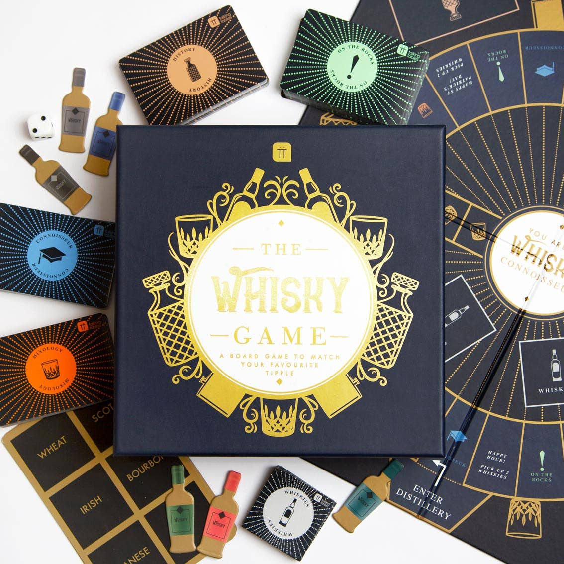 The Whisky Game by Talking Tables! A board game to match your favourite tipple. Ideal for any whisky connoisseur who knows a Scotch from a Bourbon and a single malt from a Rye. Work your way around the game board, by answering trivia questions and collecting different worldwide whiskies to win. It's a game of chance, knowledge and twists. Let the journey commence! The perfect board game for a dinner party with friends, guys night or even a bachelor party! It also makes a great Christmas present, Birthday gift or Fathers Day gift for whisky lovers. Recommended for age 21+ and 2-6 players or in teams with 6+ players. No drinking required. Contents includes: 1x Instructions Booklet, 1x Gameboard, 6x Collection Cards, 200x Whisky Themed Questions, 120x Whisky Cards, 75x On the Rocks Cards, 6x Playing Pieces and 1x Dice.