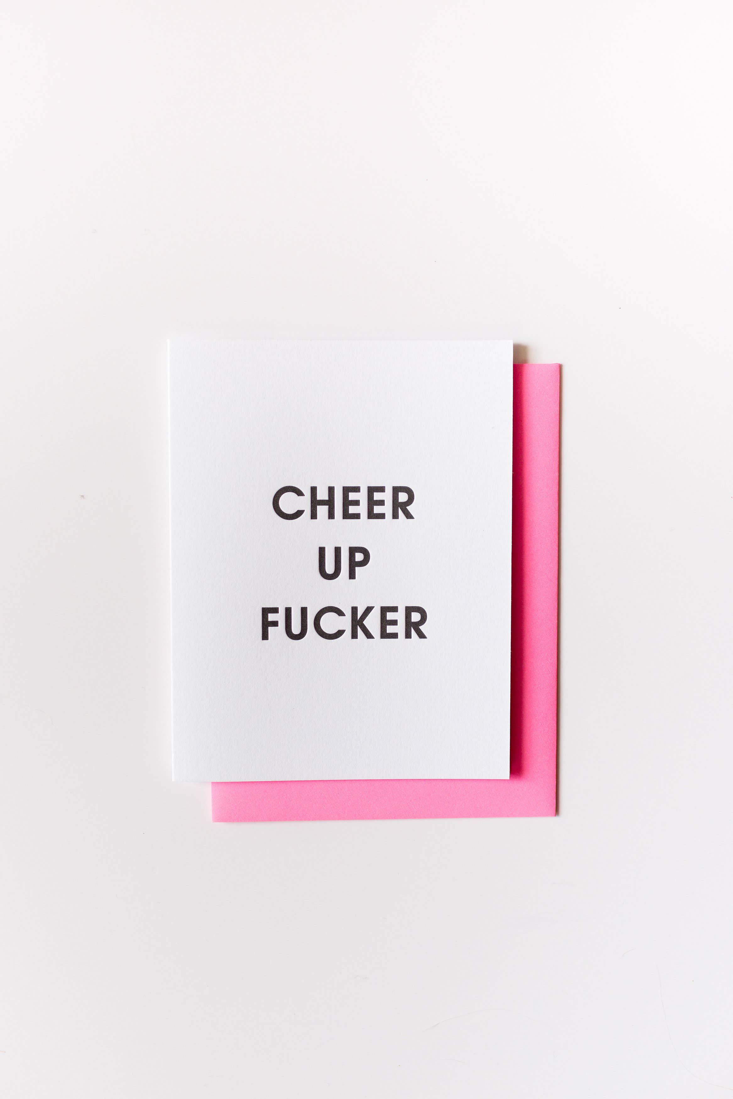 Our "Cheer Up Fucker" card is letterpress printed on a vintage printing press. •Paper: Bright White, Tree-Free 100% Cotton Paper •Ink:Black •Envelope:Neon Pink •Size: 5.5" x 4.25" •Folded card, blank inside •Sealed in a cello sleeve
