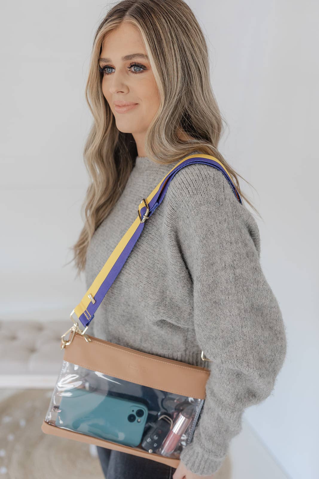 Customize any bag for Game Day or everyday with these school color purse straps and show your school spirit in style. Pair these interchangeable straps with our crossbody bags, sling bag/belt bags, and more! The perfect accessory for Back to School and a great holiday or Christmas gift! Strap is 2" wide Adjustable Strap, 29” – 52” (extended length to accommodate all sizes) Gold Hardware Woven Nylon Material Strap only, handbag not included