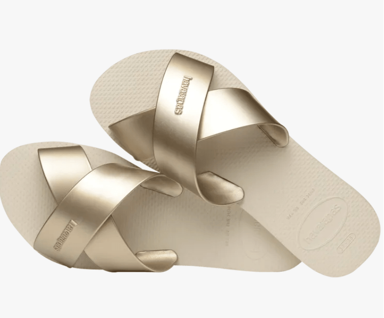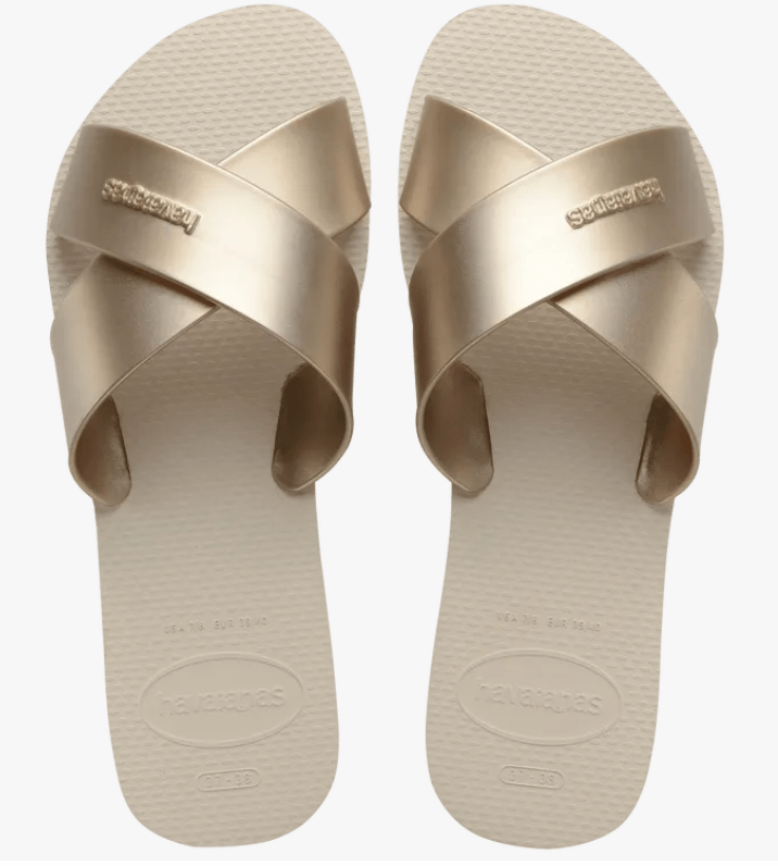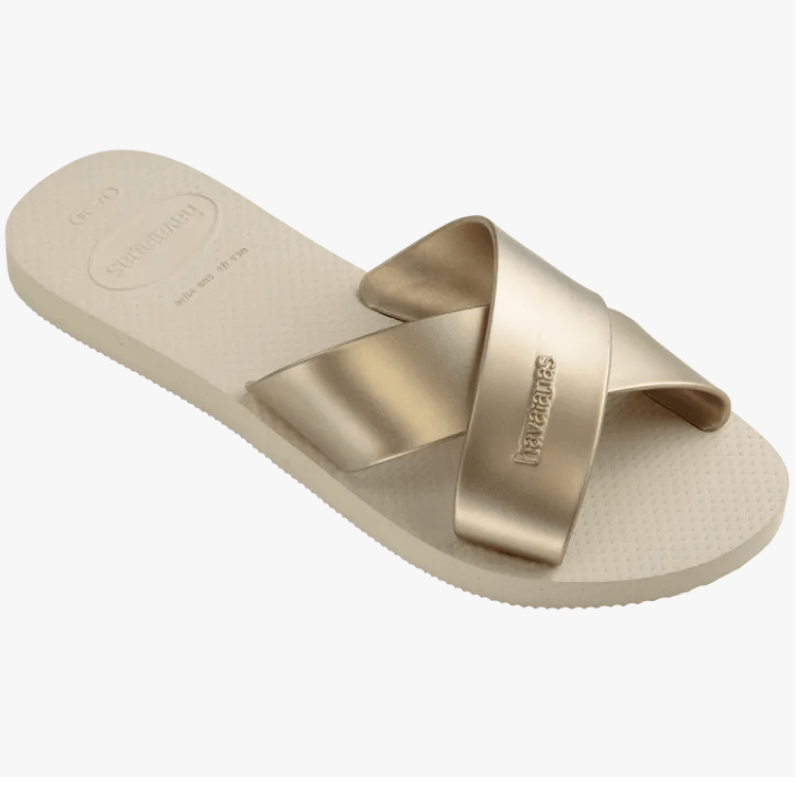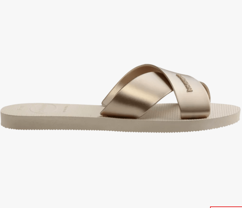 Slide into style with the Havaianas Aqua slide, a beach-ready women's sandal with two wide strips that make an easy-to-wear X shape on the front. With a metallic color palette, these extra fun, rose gold, black and navy sandals for women can be dressed up or down for any pool party or summer night out!