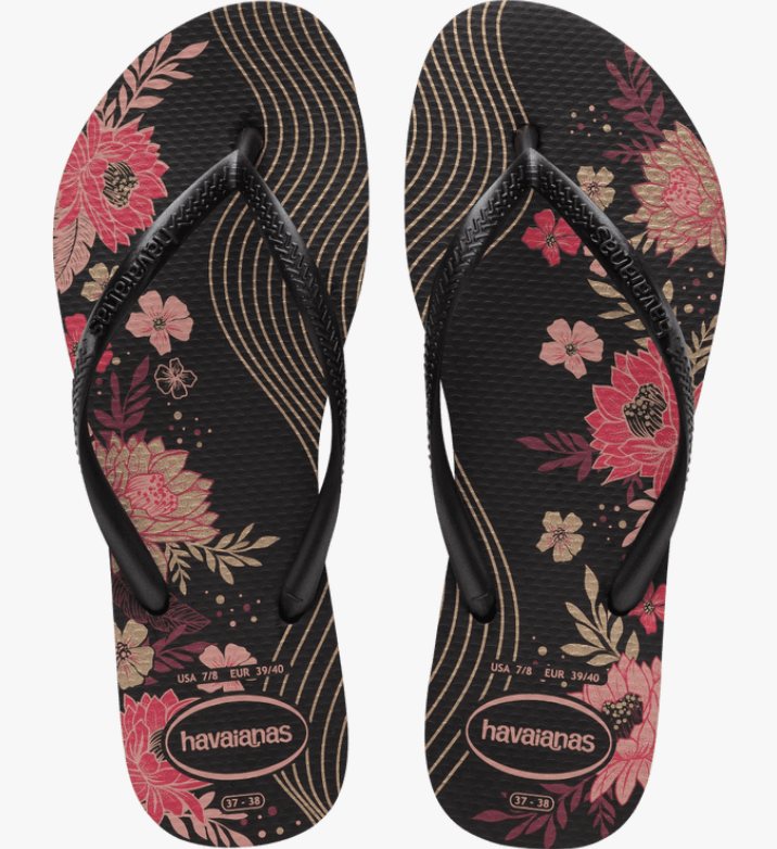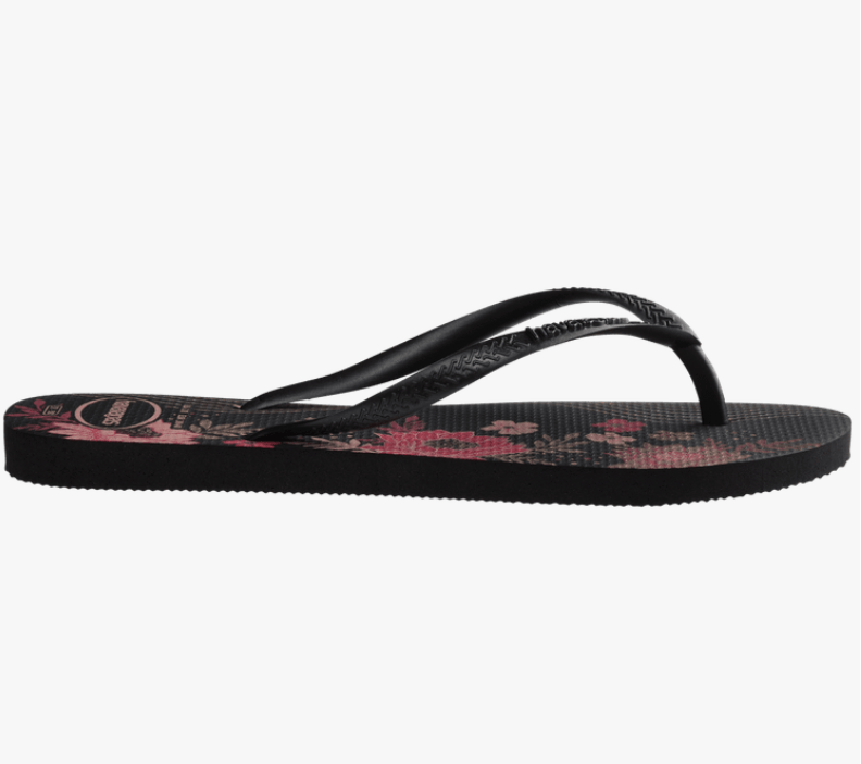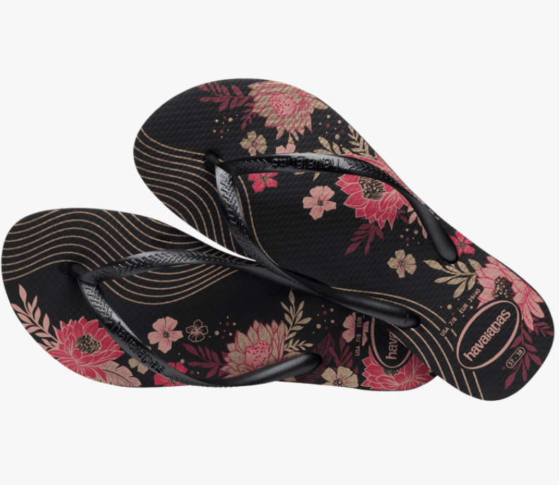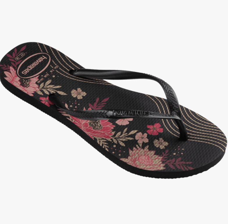 The Slim Organic is one of Havaianas' most popular printed flip flops. With thinner straps and a lighter sole, this model has a floral print on the sole and straps with a metallic effect. Perfect for romantic and sophisticated style.