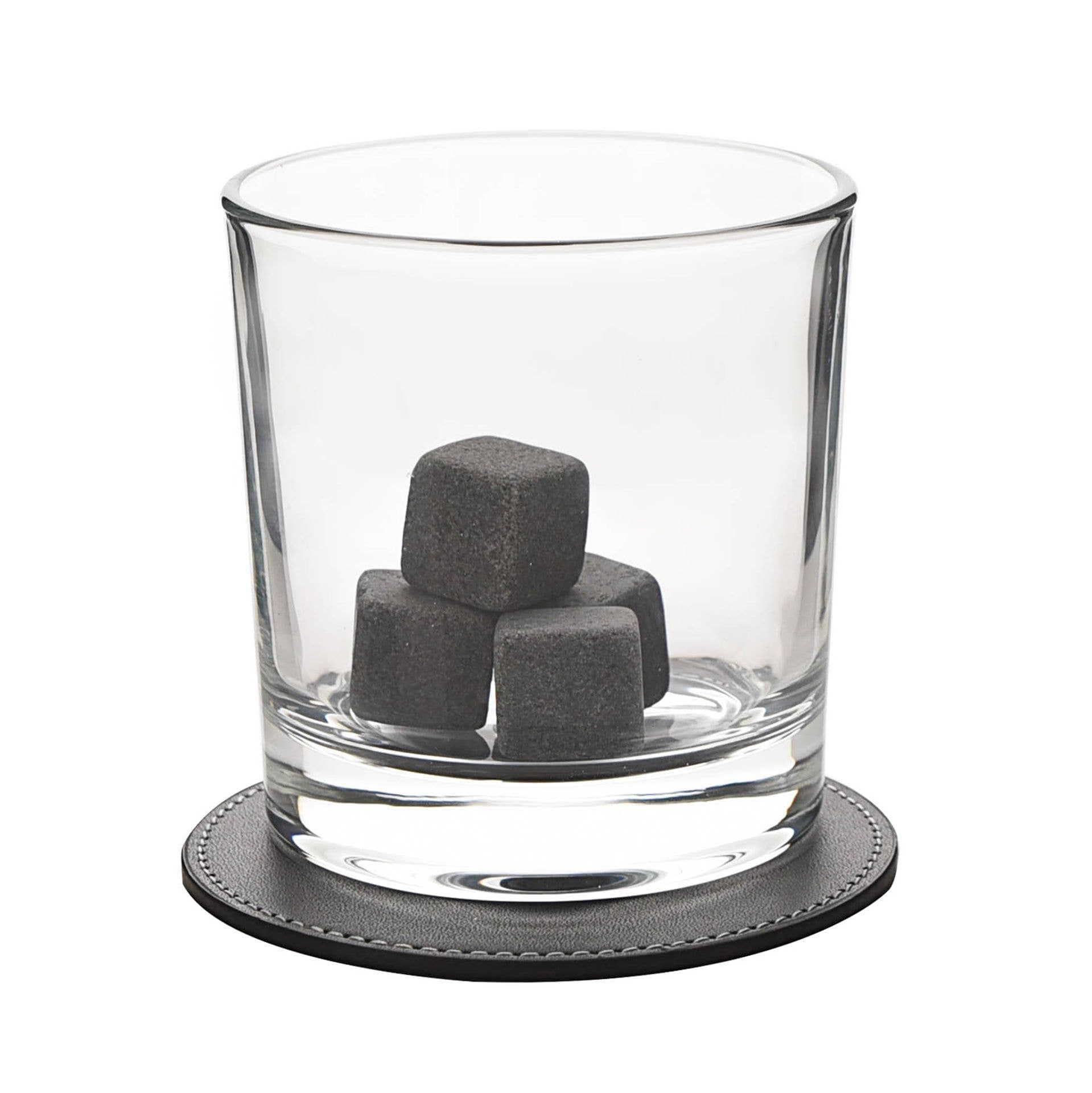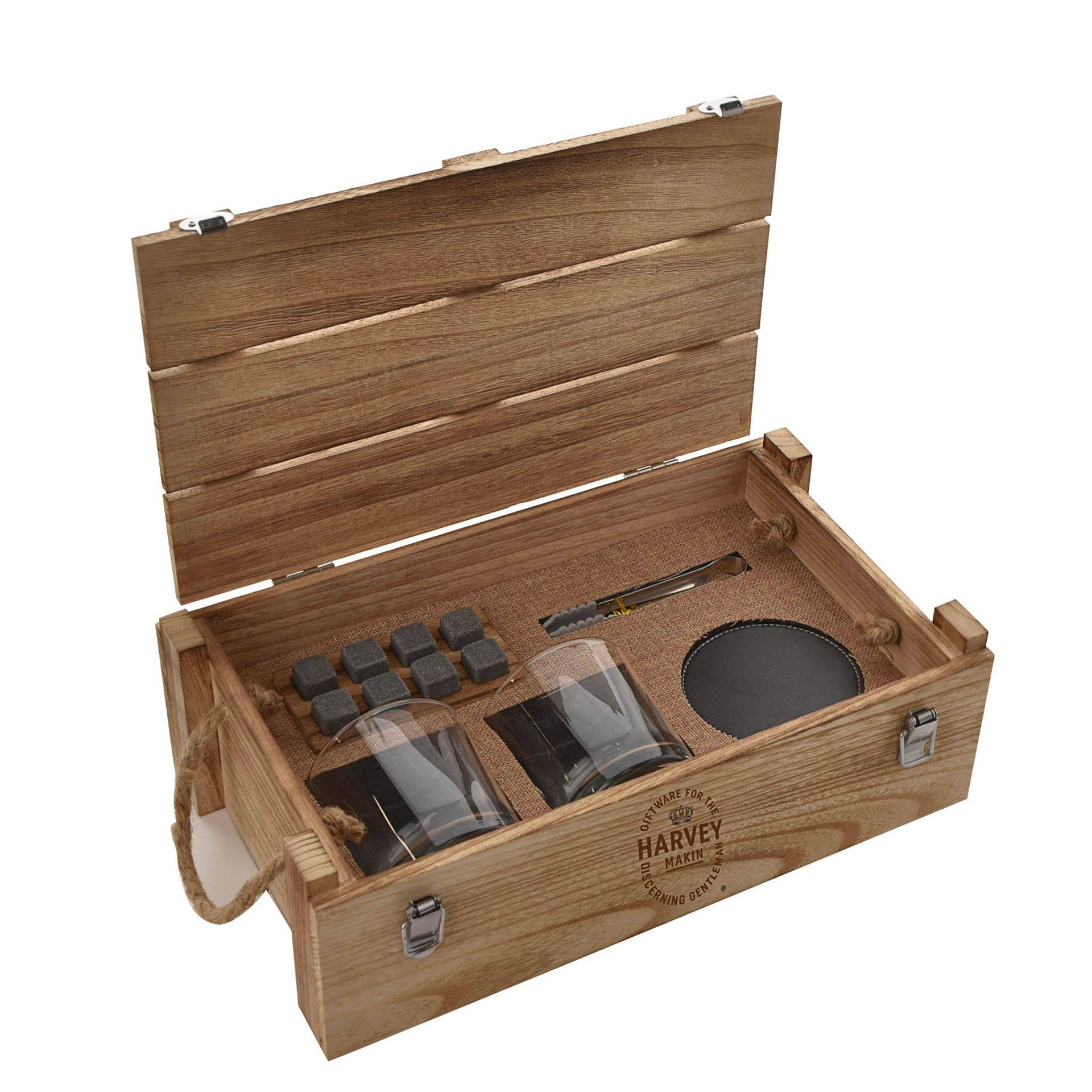 A whiskey set from the Classic Collection by HARVEY MAKIN®. This bespoke set ensures whiskey galore for those who enjoy a dram or two. The wooden tray features a rustic appearance, complete with rope handles, metal glasps and ‘Harvey Makin’ stamp. Inside is a set of two whiskey tumblers, coasters, tongs and reusable stone ice cubes. The set is packaged in a wooden box (pine).
