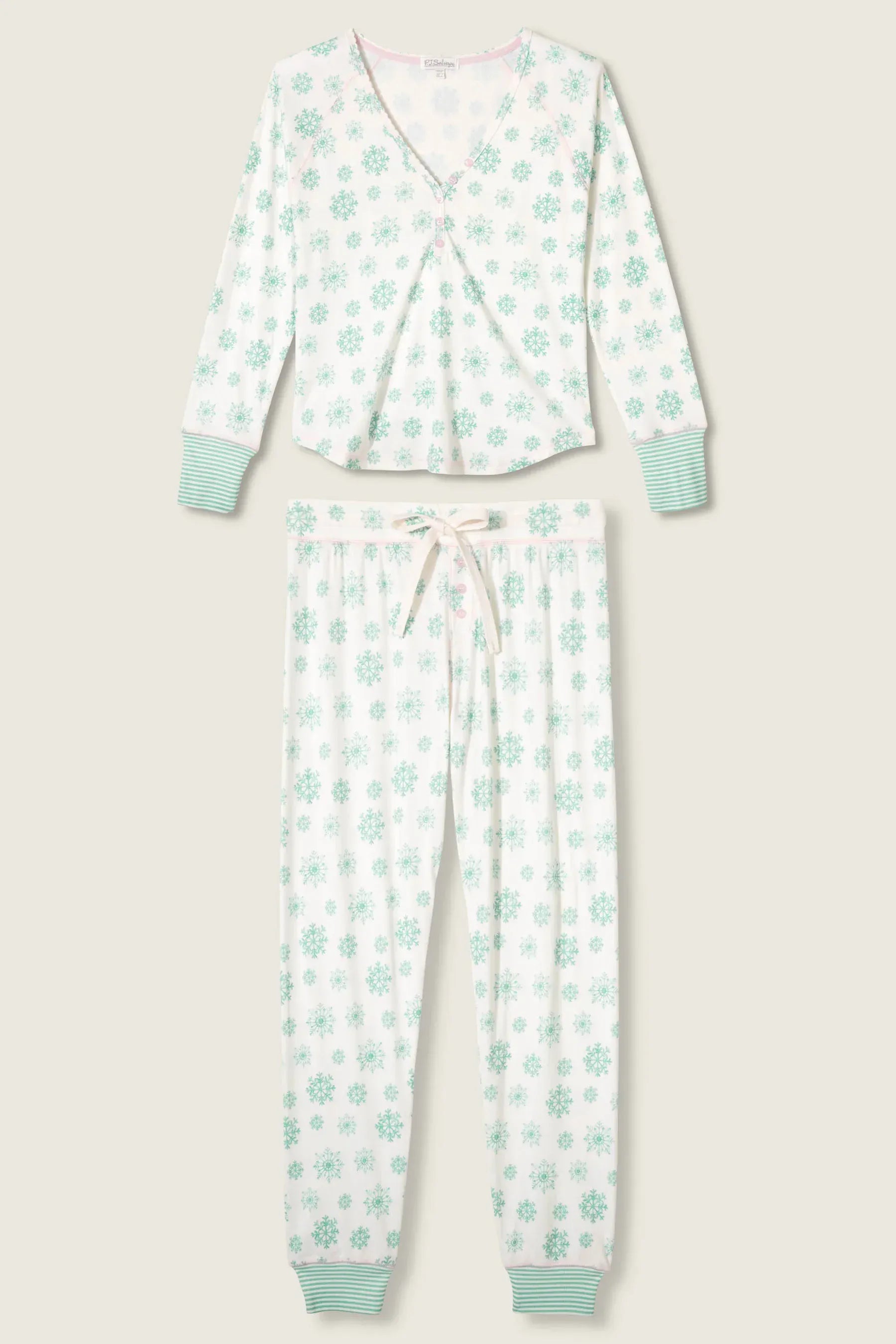 Women’s ivory pointelle pajama set with green snowflake print, V-neck henley long sleeve with striped cuffs, jogger pants with pink tie.