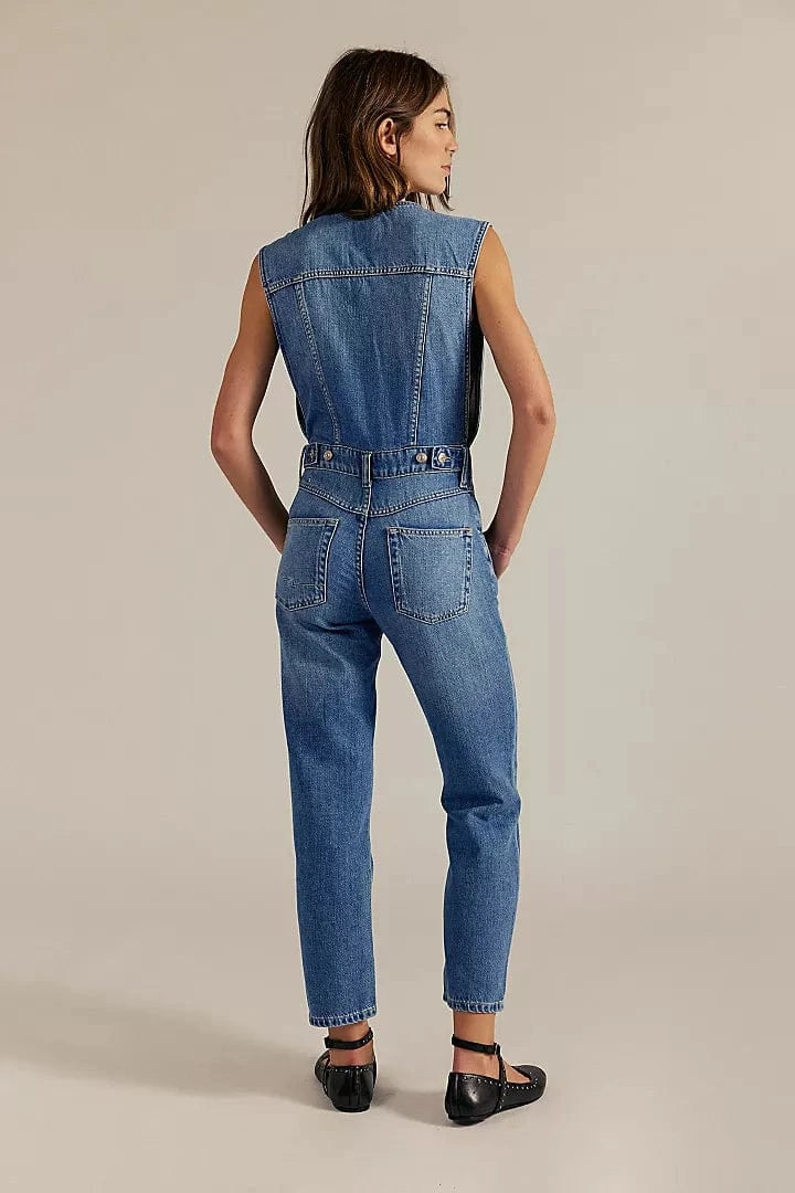 Utility-inspired and oh-so classic, this denim jumpsuit from We The Free is featured in a sleeveless style with a high-rise, straight-leg bottom and button-front top for a timeless, flattering look.