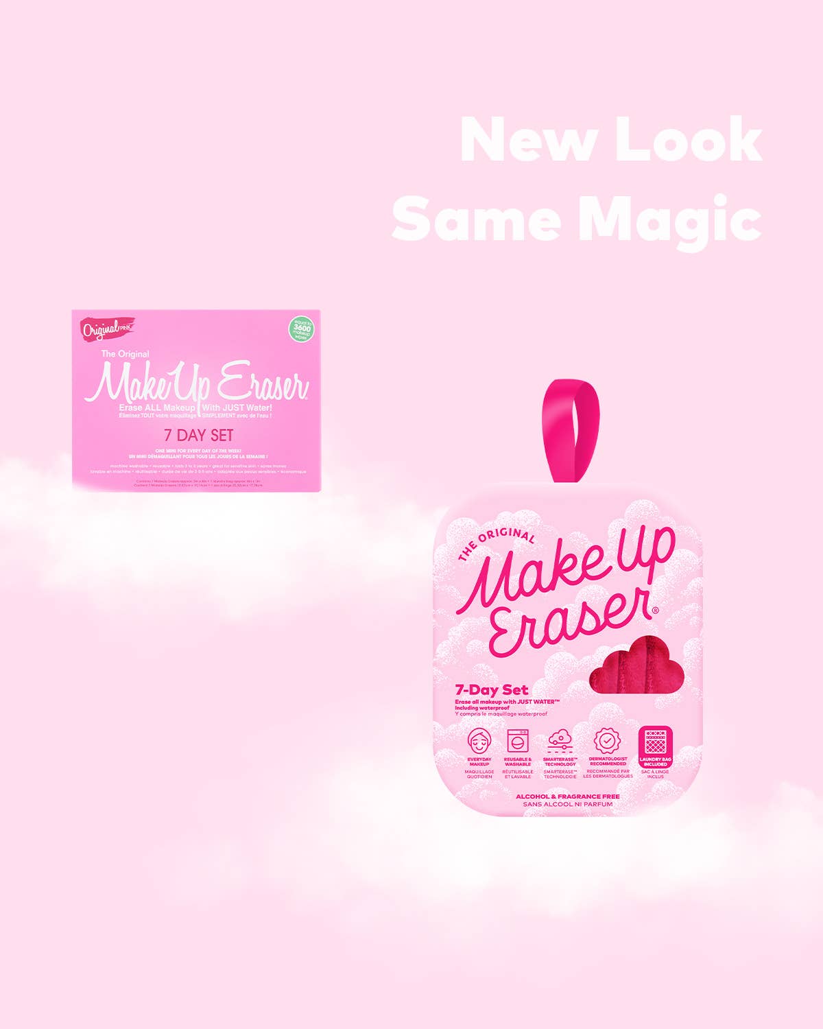 "Same Magic, NEW LOOK" Includes 7 Daily MakeUp Erasers, 5in x 4in. Laundry bag included. Erase all makeup with JUST WATER™ including waterproof. Our patented, water-activated, cloud-soft fibers gently & easily remove all makeup & sunscreen from pores. 2 in 1 benefit: one side erases makeup & one side exfoliates skin. ✓ Dermatologist Recommended for sensitive skin ✓ SmartErase™ Technology ✓ Reusable & machine washable ✓ Great for everyday makeup The Original MakeUp Eraser® is non-irritating and non-drying, making it perfect for sensitive skin. It's non-comedogenic, safe for lash extensions, & entirely oil-free for a fresh, comfortable experience. ALCOHOL & FRAGRANCE FREE How to use: Wet with warm water. The warmer, the wetter, the better! Use gentle circular motions to erase makeup with the short fiber side. Flip to long fiber side (side with tag) to exfoliate the skin. Care: Machine wash hot & dry. Dryer sheet & fabric softener safe. Machine wash before first use.