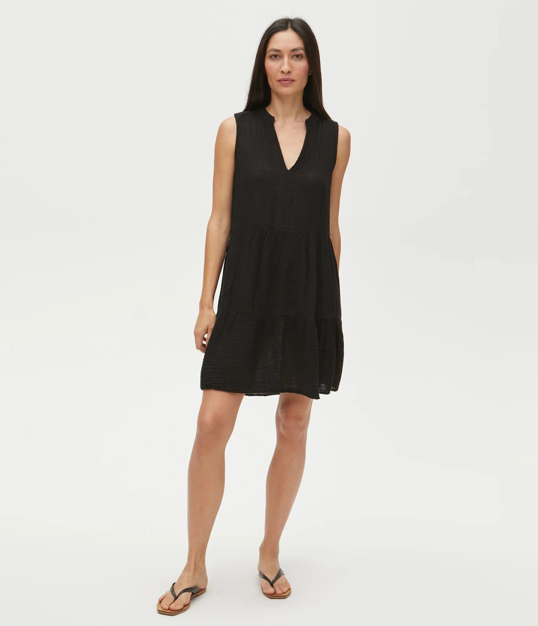 Chic and simple, the sleeveless Daisy dress is made from breezy double gauze, with a notched neck and a tiered skirt on an empire waist.