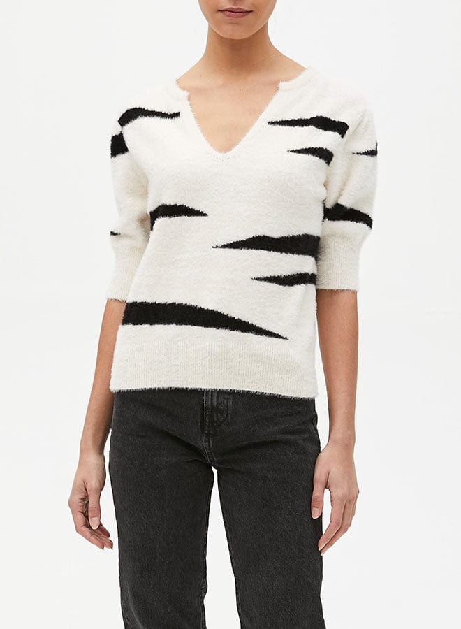 Show off your wild side in the Honey pullover. Designed in soft sweater faux fur, this fall knit features a tiger stripe print, v-neckline, and short sleeves.