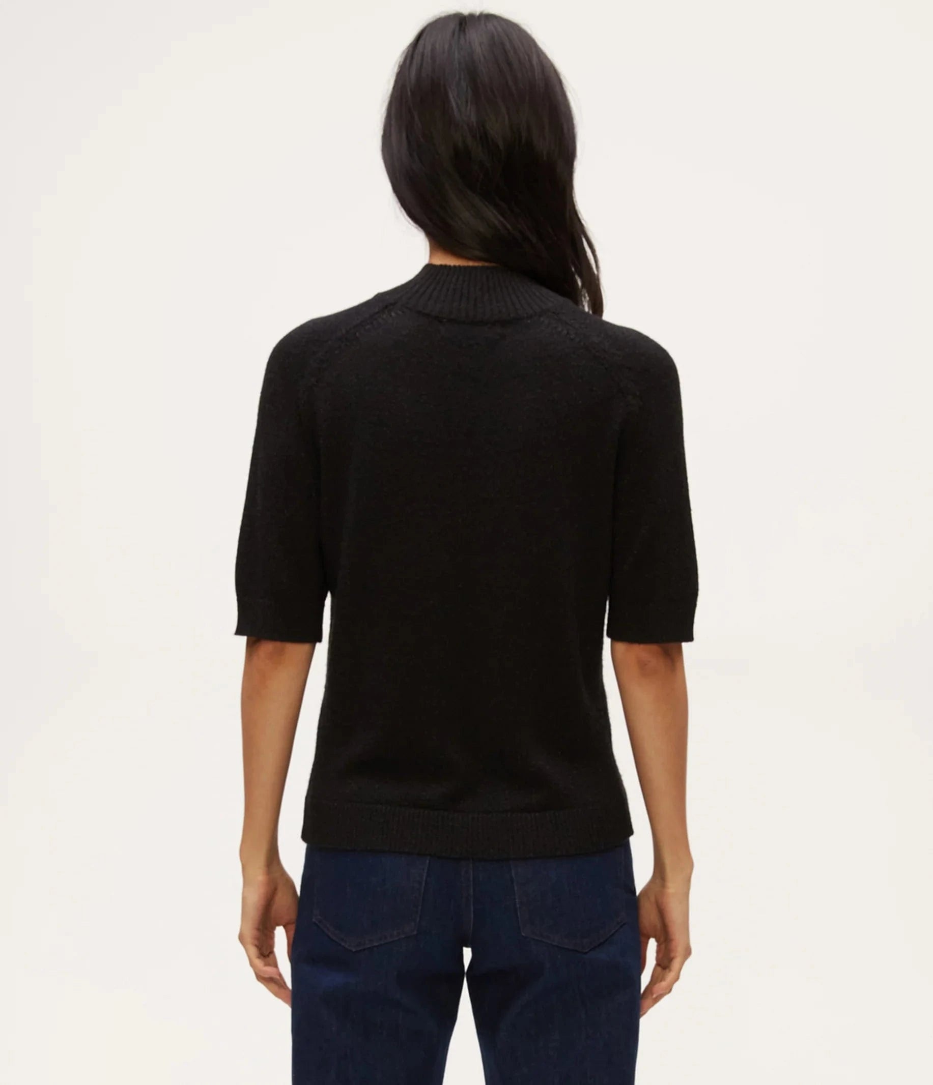 Effortlessly chic, this fitted mock neck sweater is a perfect day-to-night piece. This luxe sweater has subtle metallic yarn plating on the outside finish, leaving an exquisitely soft brushed inside for a plush hand feel. The neck and short raglan sleeves are ribbed.