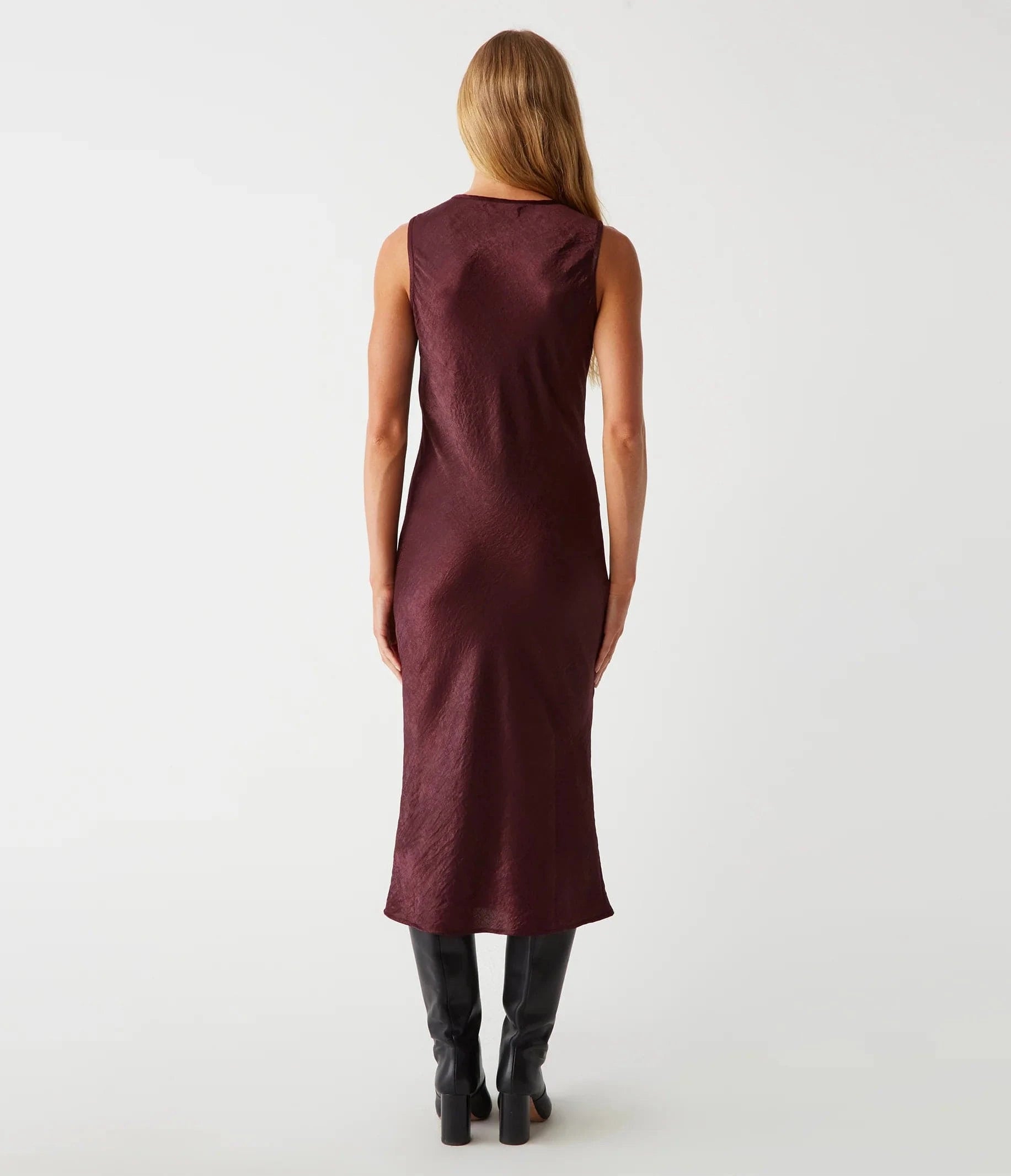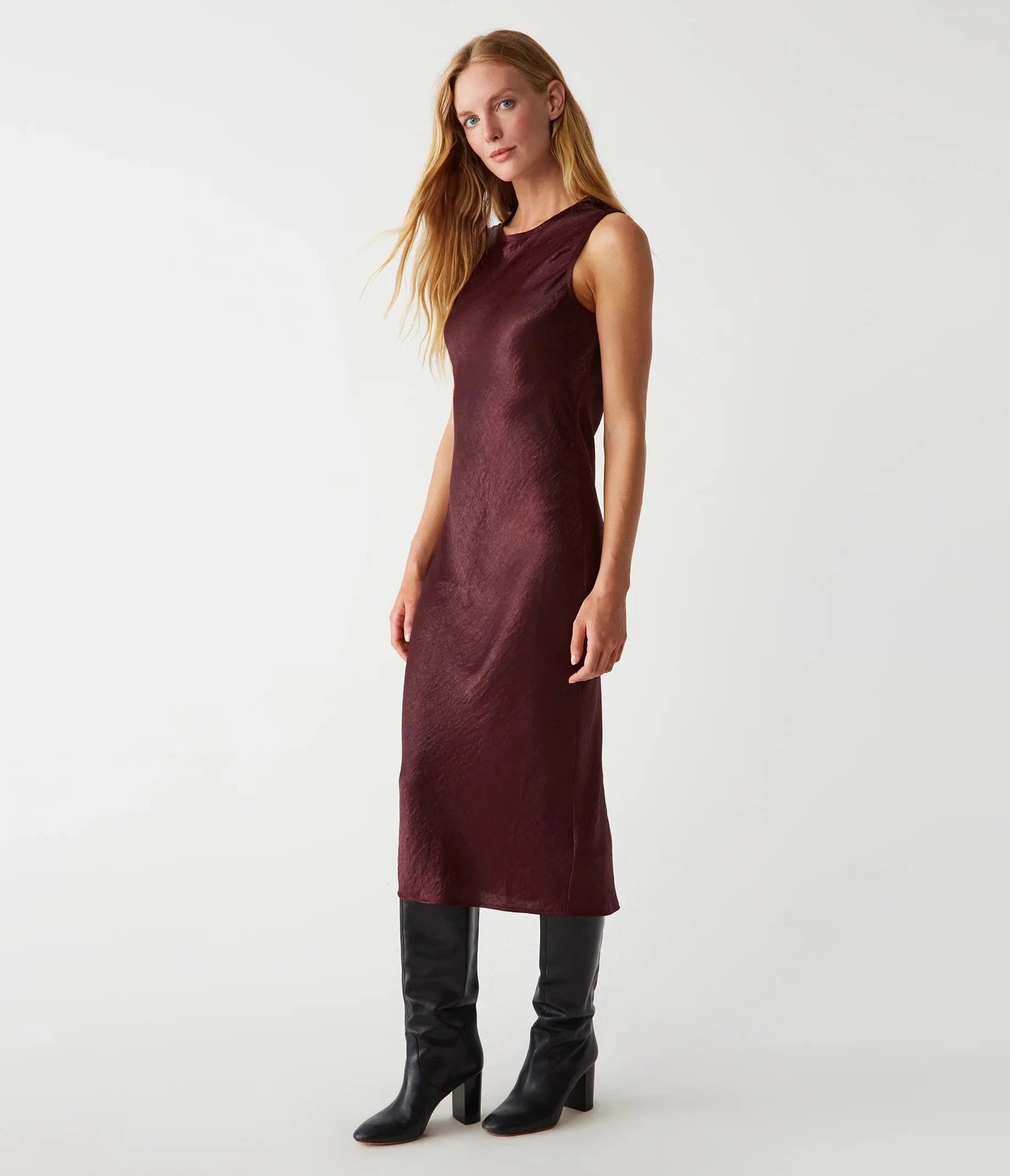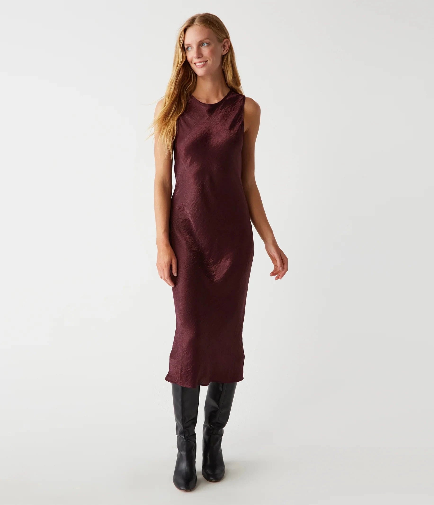 Cut on the bias, the Seema midi dress is designed in a floaty, body-skimming shape that moves beautifully as you walk. This pull-on style has a high neckline and is made from lustrous hammered satin that drapes nicely over your frame. Wear yours solo or layered under the Paula Blazer.