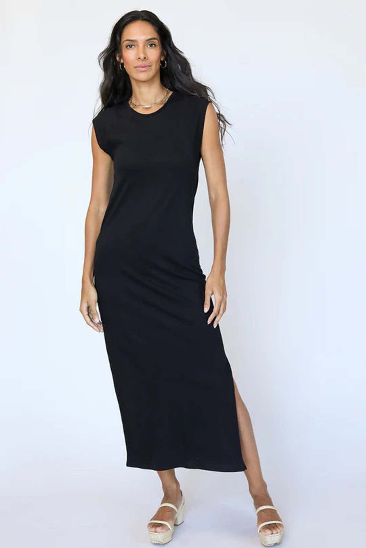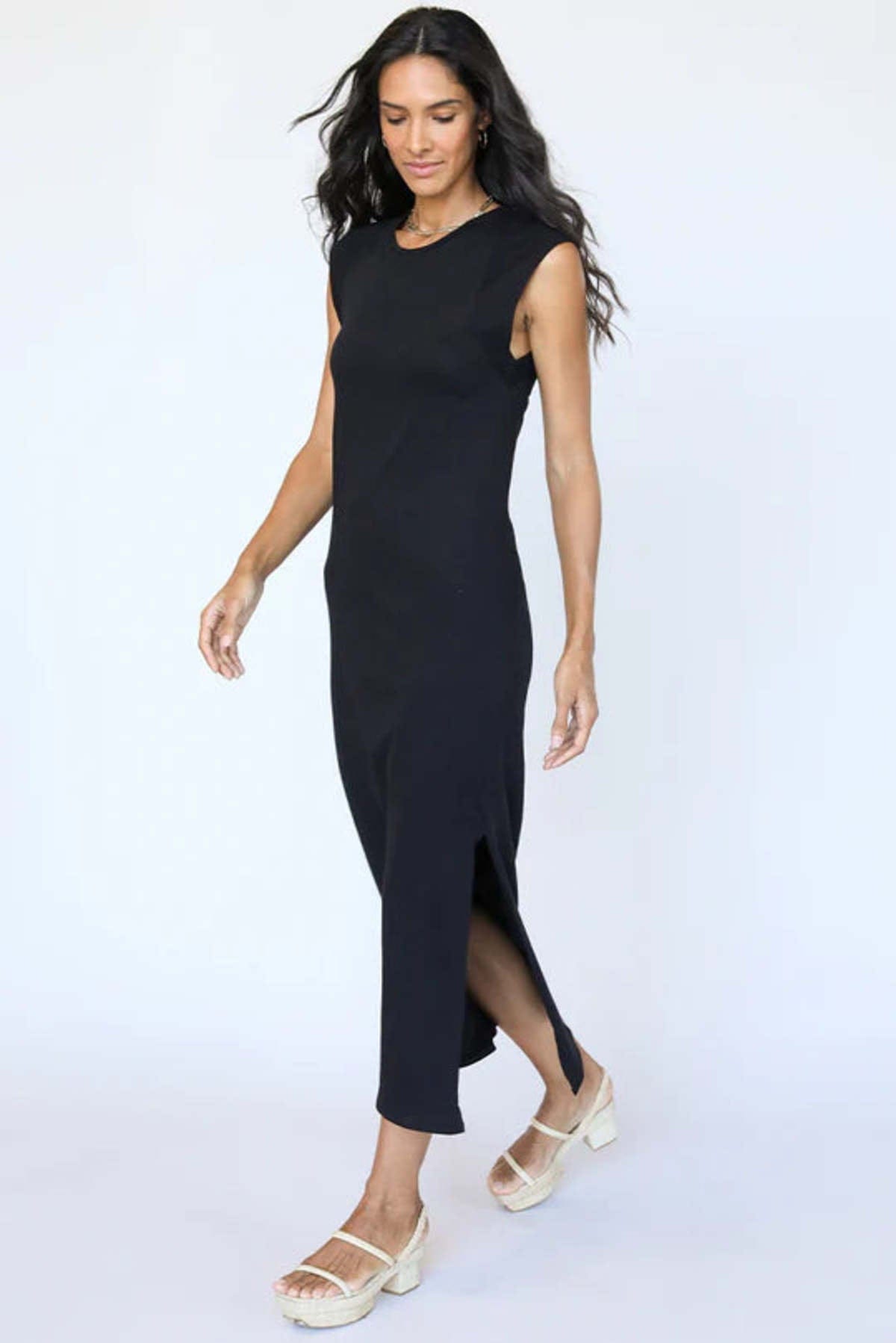This super soft, black, midi crew neck dress is perfect for a lunch during the day and a bonfire at night. That incredibly perfect tee-shirt made into a dress. Easy to wear, day to night, night to day.