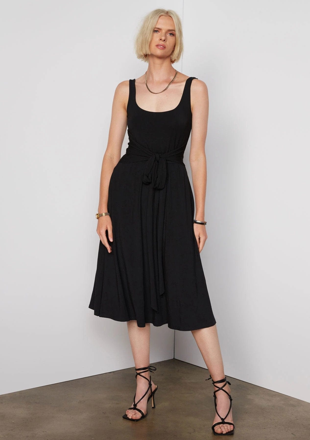 A wardrobe classic in the making. The Lynee Midi dress is finished with a nipped waist and bold, swingy skirt. Self-sashes tie at front.