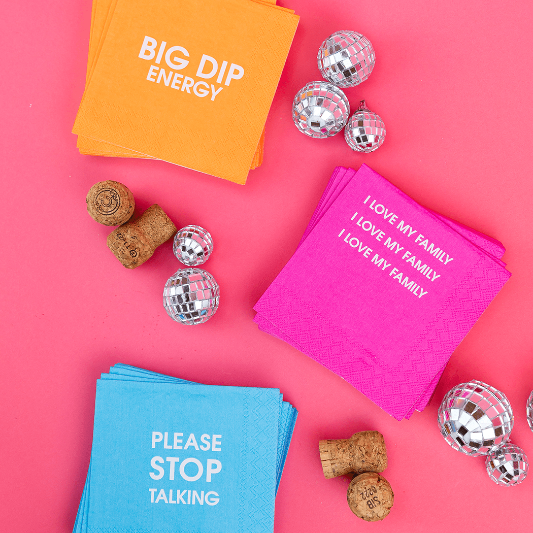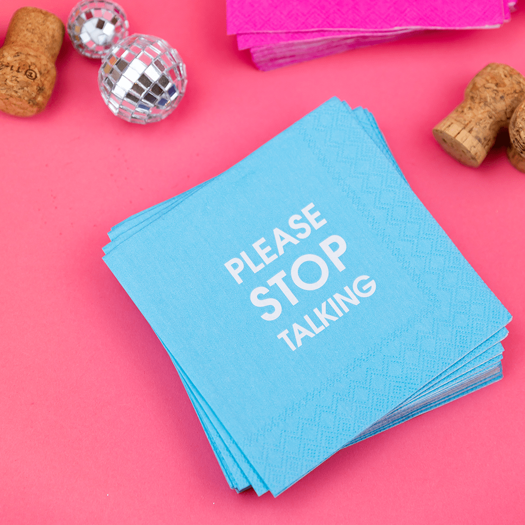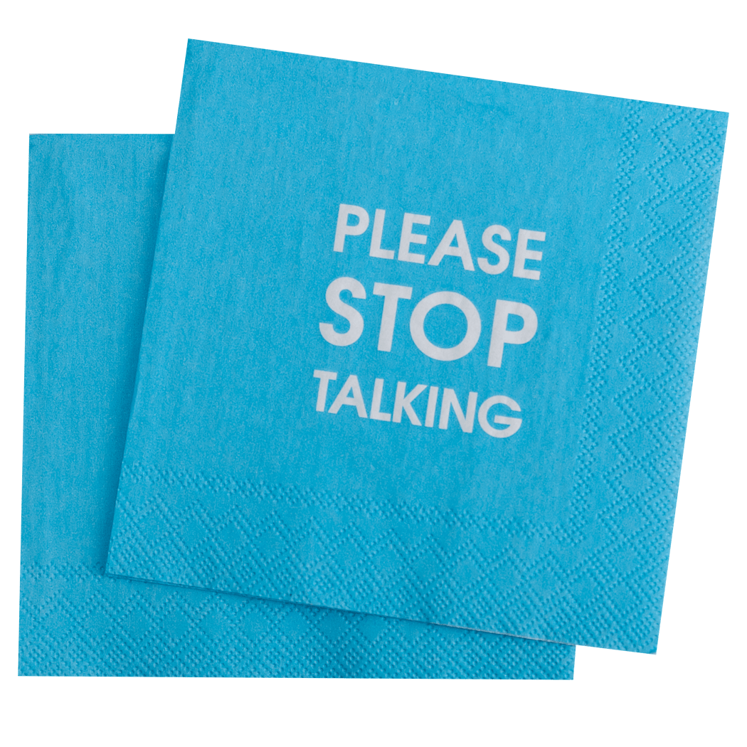 Please Stop Talking When words fail, let your napkin do the talking. Perfect for those moments when you wish silence was the secret ingredient in your drink. Sealed Cello of 20 3-ply napkins Size: 5 x 5 in, 10 x 10 in when unfolded Printing: White Ink Napkin Color: Caribbean Blue