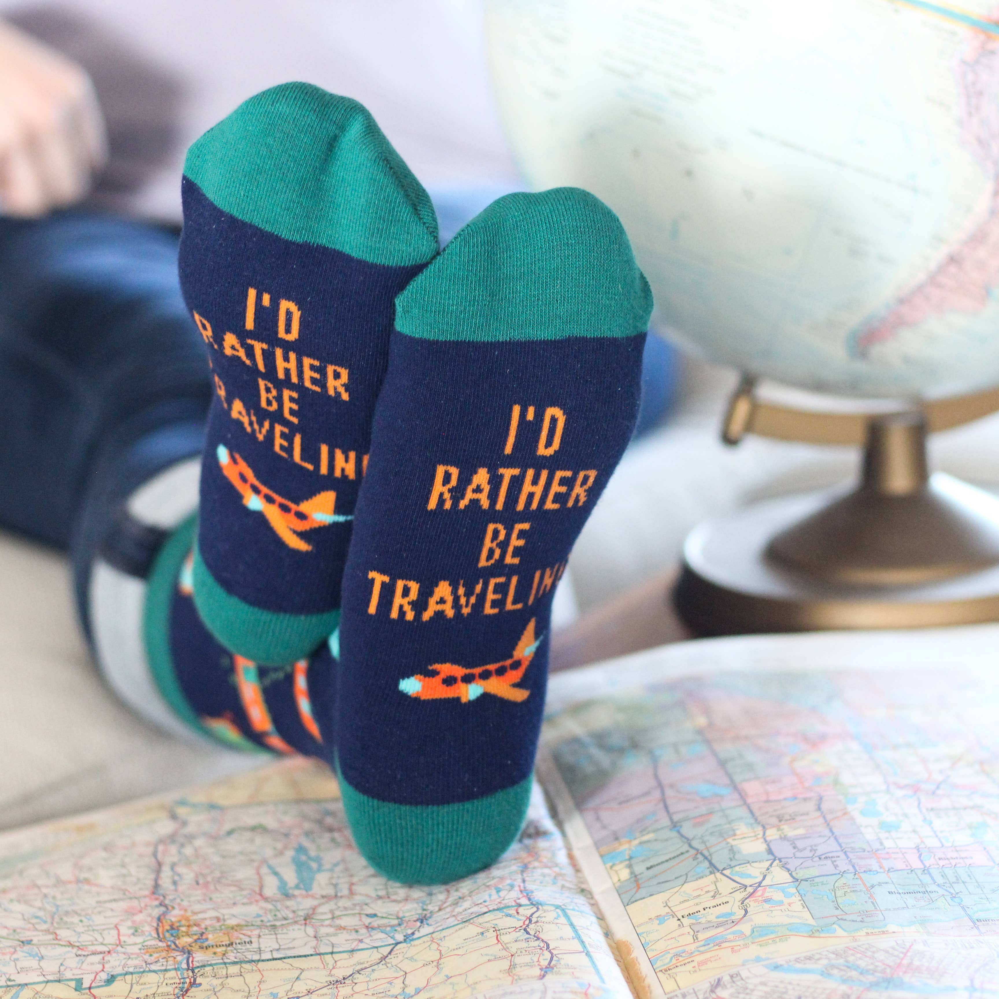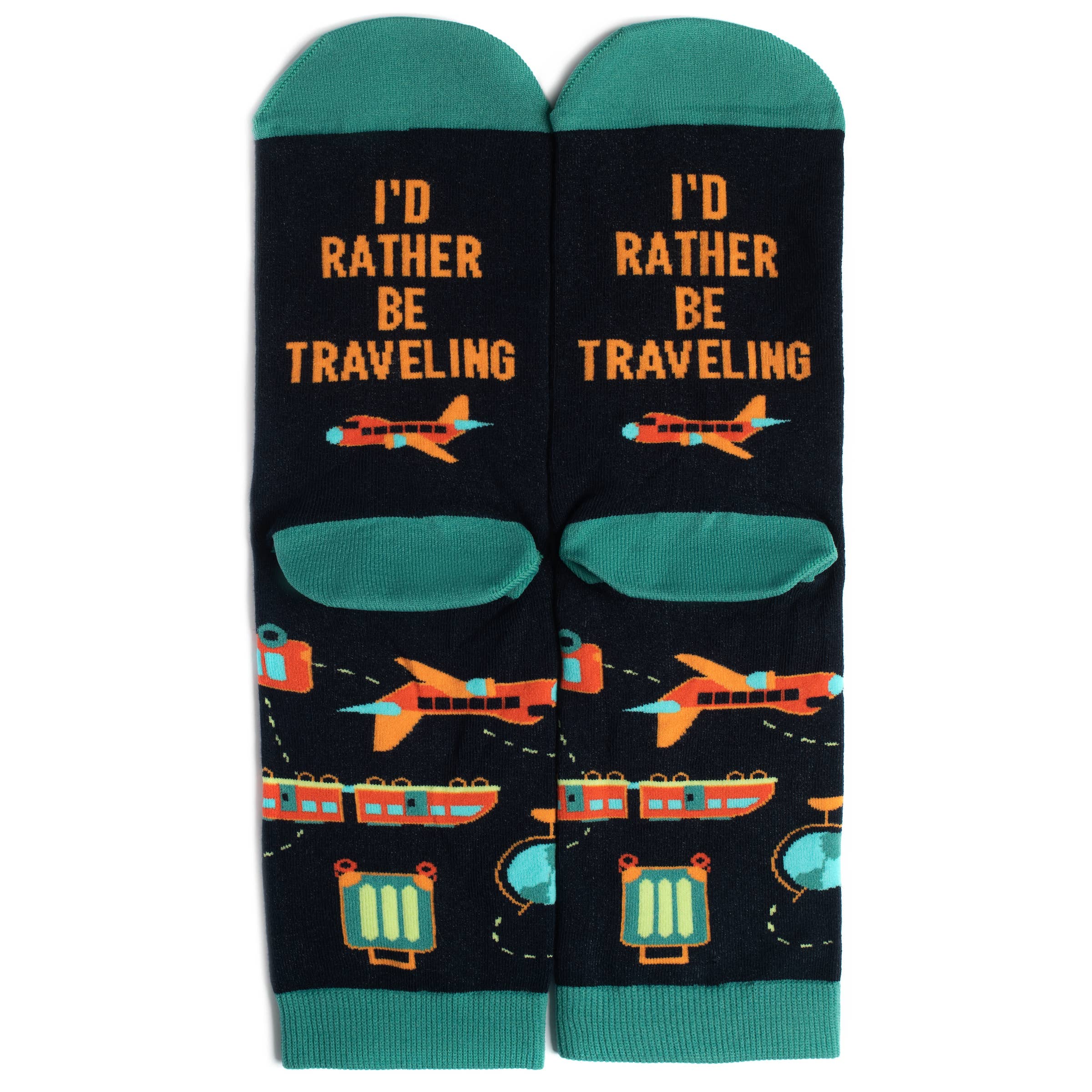 Show off your adventurous spirit with these fun novelty socks for men and women who love travel - Featuring original illustrations of airplanes, trains, cruise ships and more, along with a funny message on the bottom: "I'd Rather Be Traveling". They’re a perfect way to say “Bon Voyage”, a gift that travelers can bring on their trip - and you should always pack an extra pair of socks!