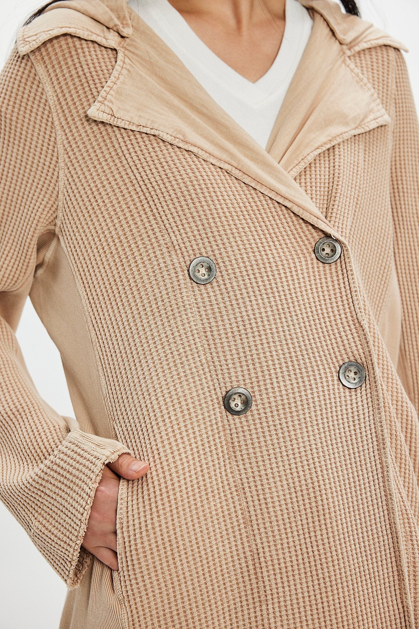 Features: Double-breasted button closures, classic collared neckline, soft waffle knit, side pockets