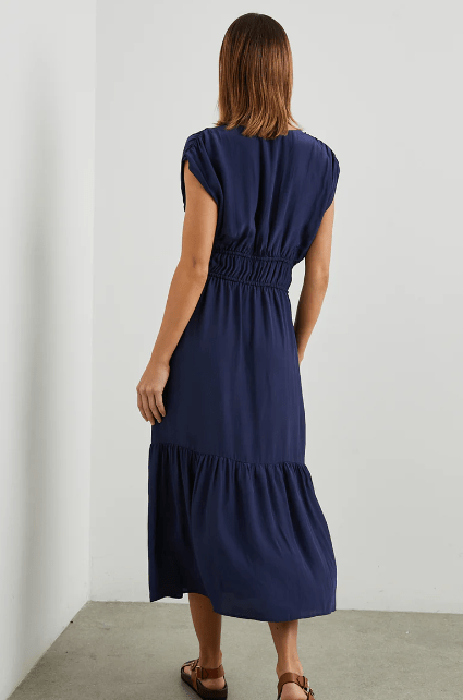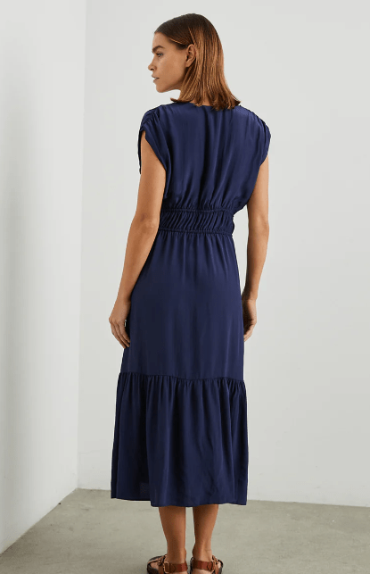 The Aletta dress is crafted from delicate drapey crepe with shirred panels at the shoulder and double tie waist. Wear with a Rails denim jacket or dress up with heels.
