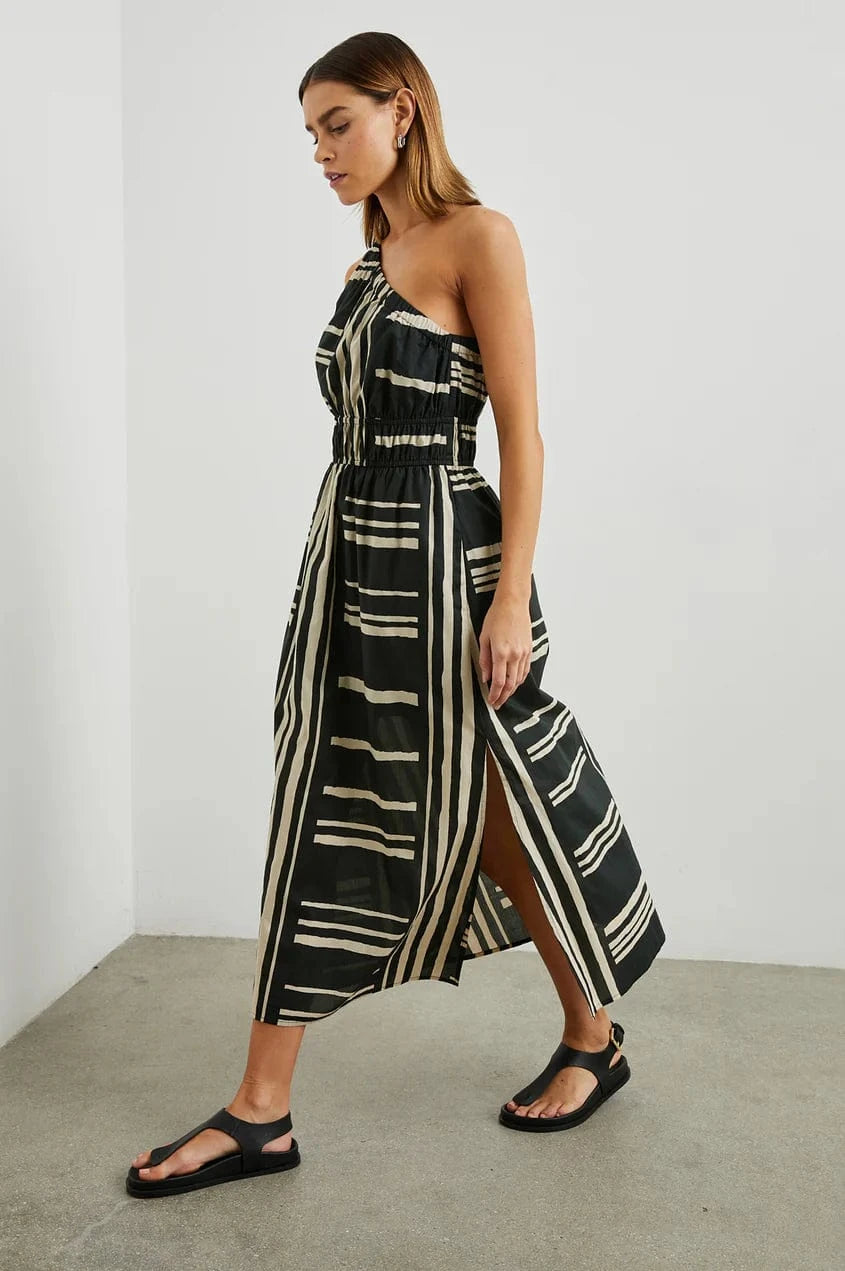 An asymmetrical dream. The Selani Dress is made from crisp cotton poplin and features a one-shoulder strap that cuts across the chest, cinched elastic at the waistband, and a flowy a-line skirt silhouette.