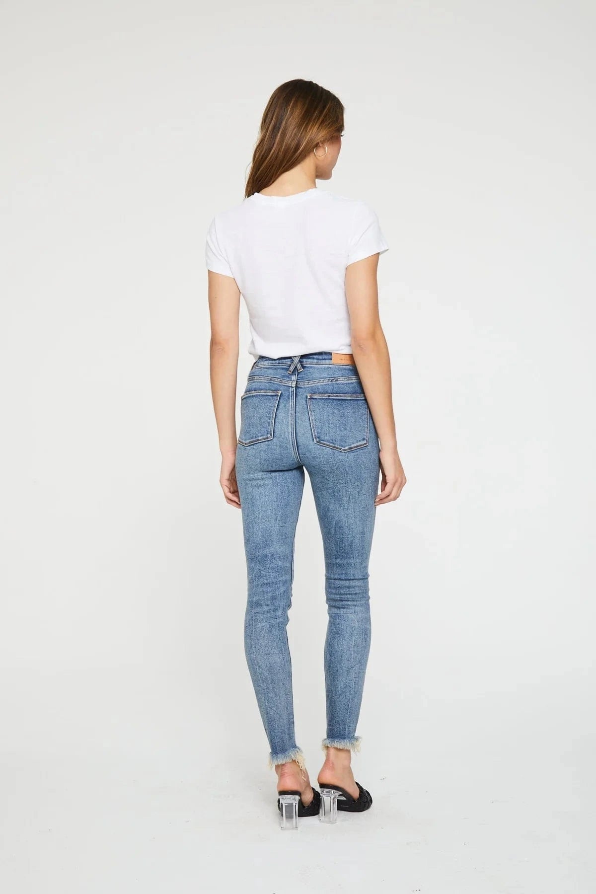 Super high rise ankle skinny jeans. It's the flirty fit that sits at the natural waist and fitted skinny in the hips through the leg. Ankle inseam on comfort stretch denim accented with back "X" belt loop, hand sanding hip & back knee & spider knee whiskers, easy pocket grindings, random netting effects, frayed hem details.
