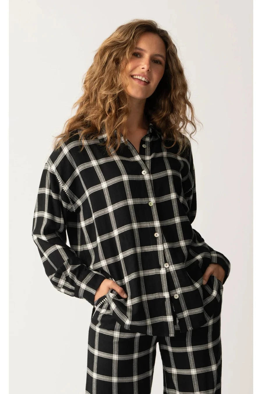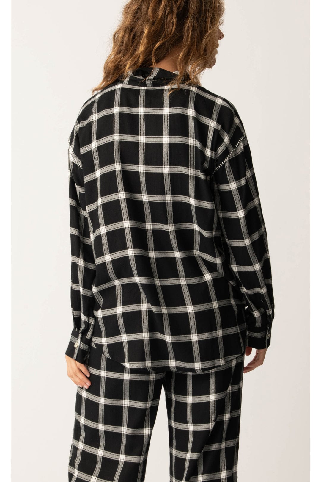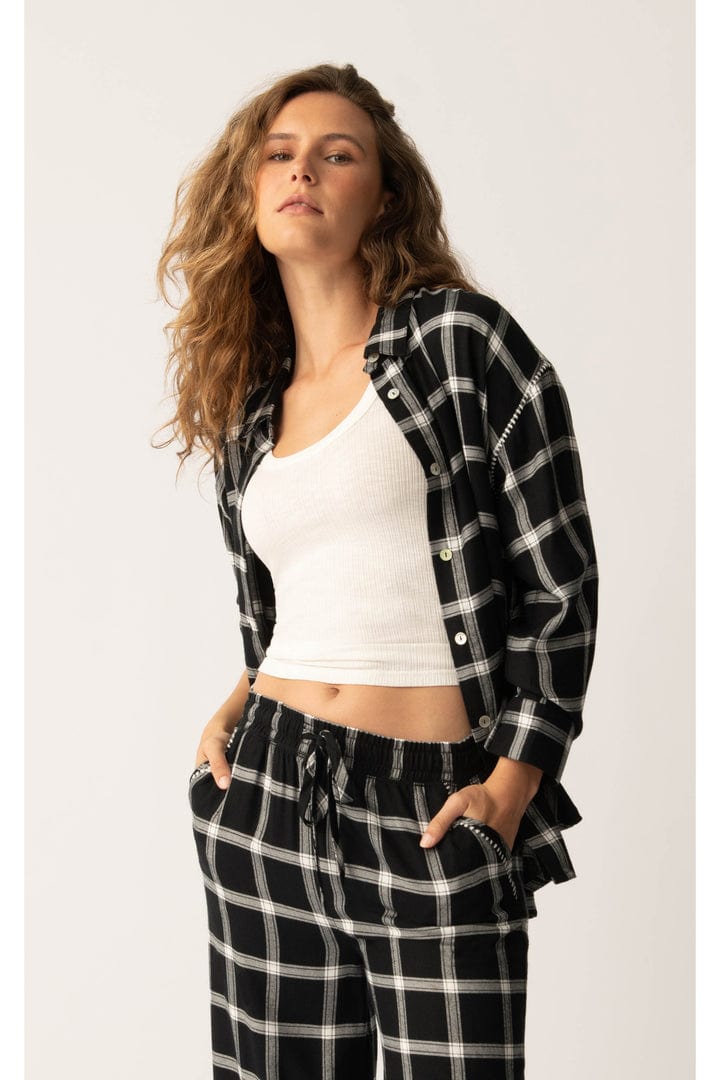 Stay cozy and stylish in this classic black and white plaid lounge flannel. Soft and warm, this flannel is designed for maximum comfort, making it ideal for relaxing at home. With its timeless plaid pattern and relaxed fit, this lounge top is a go-to piece for laid-back days or cool nights in.