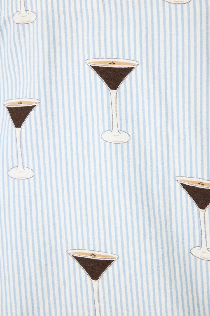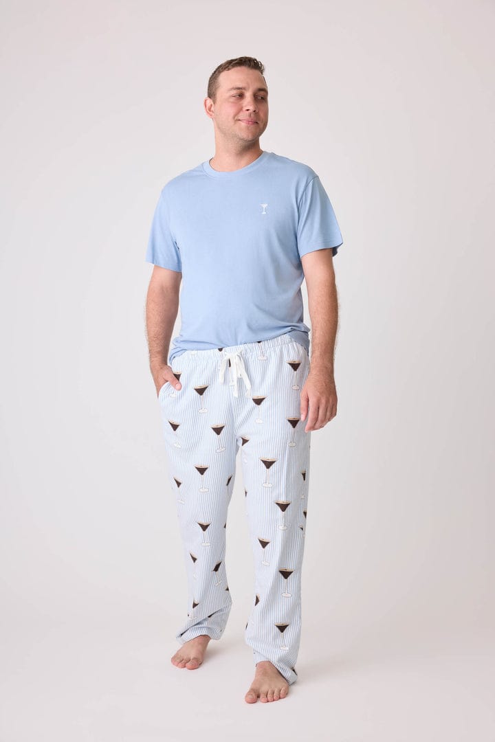 Lounge in style with this men's blue and white striped PJ set, featuring an espresso martini pattern. The collared top and tie waist pants combine comfort with a fun, sophisticated design, making it the perfect choice for a cozy night at home.