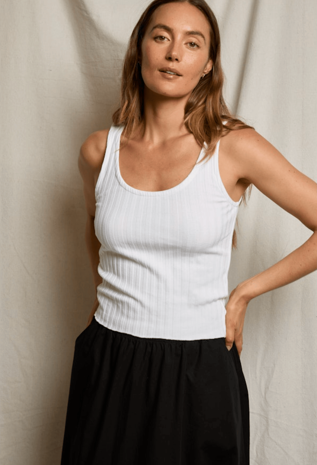 The ribbed texture adds subtle structure while maintaining stretch and comfort, making it a go-to staple you’ll reach for year-round. Minimal, timeless, and endlessly wearable — this is the tank that anchors any wardrobe.