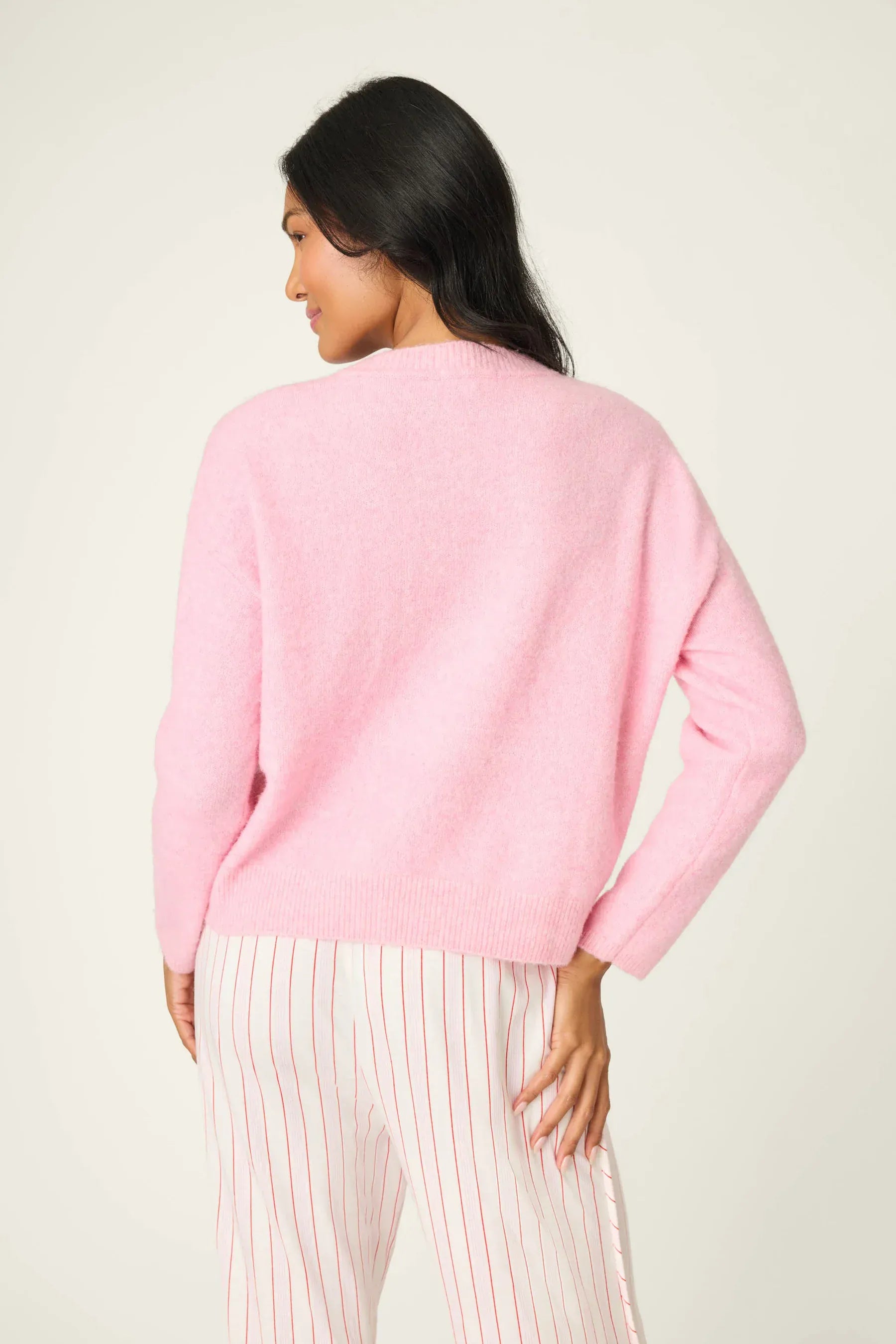 Soft and sweet, this pink crew-neck sweater brings cozy charm to your winter lineup. Knit from a cotton-acrylic blend with a fuzzy finish, it features a “Lover” graphic across the chest for a look that’s as comfy as it is classic.