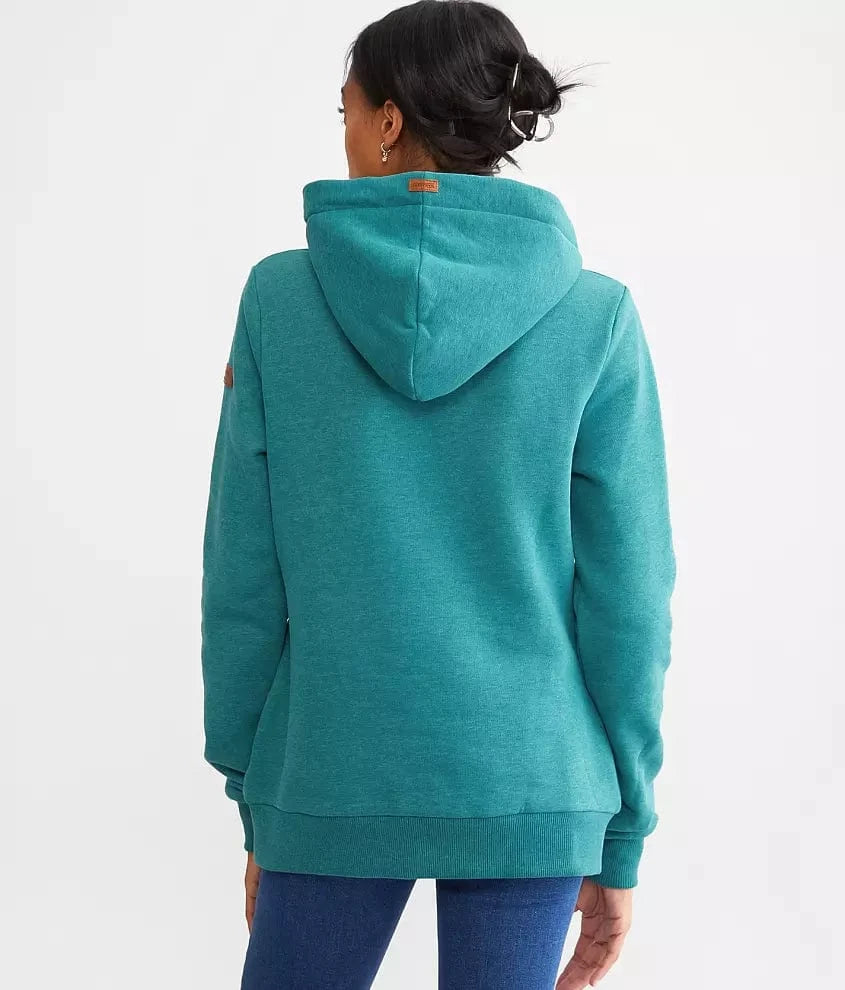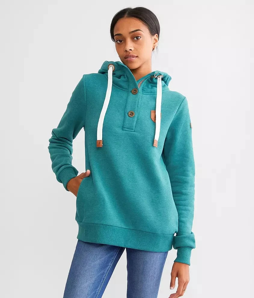 A modern day take on your favorite hoodie has arrived. The pop of color and soft fleece lining make this hoodie a must have for any gal who loves adventure. The Jas Pullover Hoodie has a high-necked hood, three front buttons, ribbed cuffed, and a cozy feel. Stay comfy and stylish, no matter the weather!