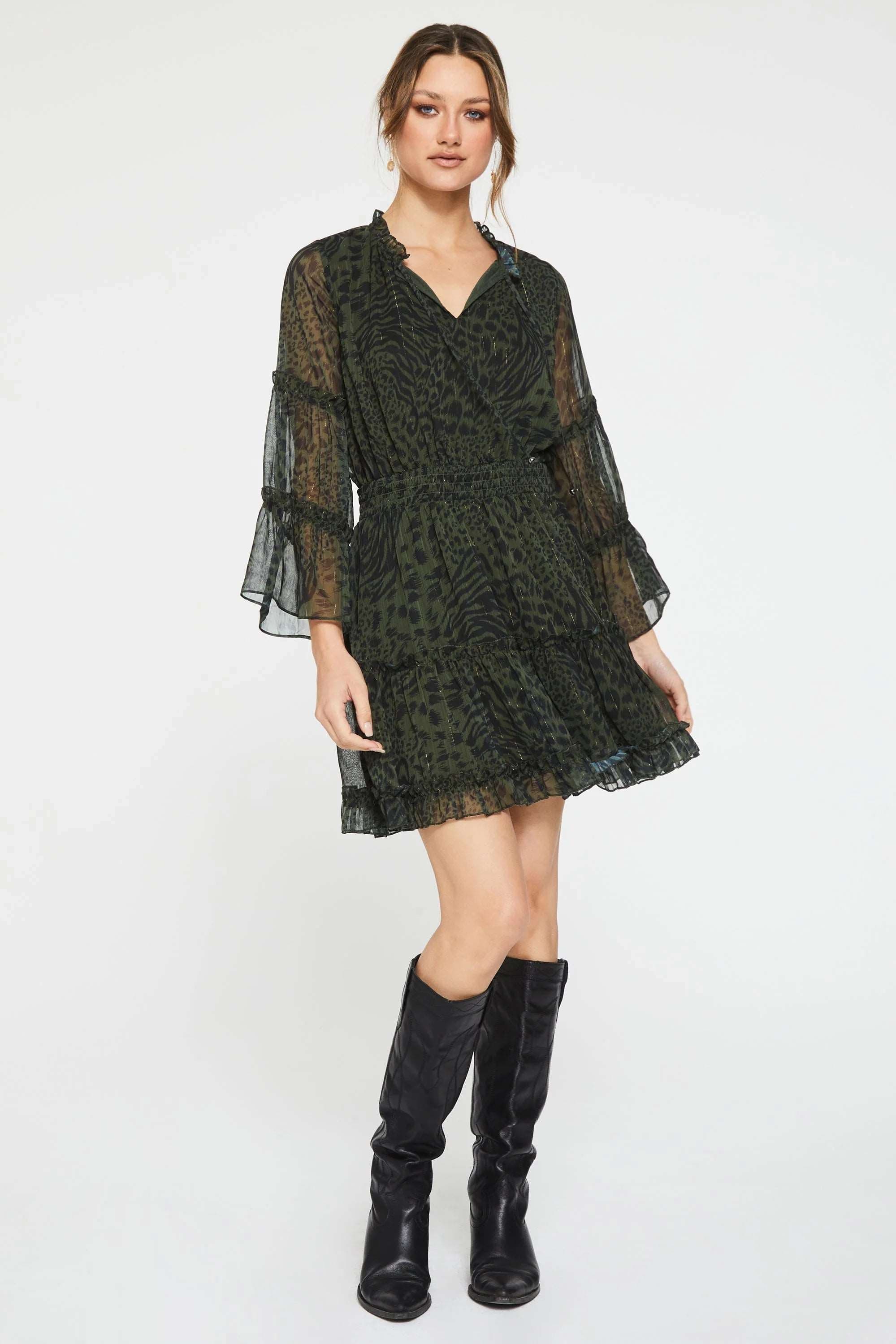 Tiered ruffle dress, bell long sleeve front slit finished with mult-stitch elastic waistband in statement animal print with sheer lightness. The tiger print is fearless, giving you the ultimate prawl to do anything. Multi print woven on relaxed fit.